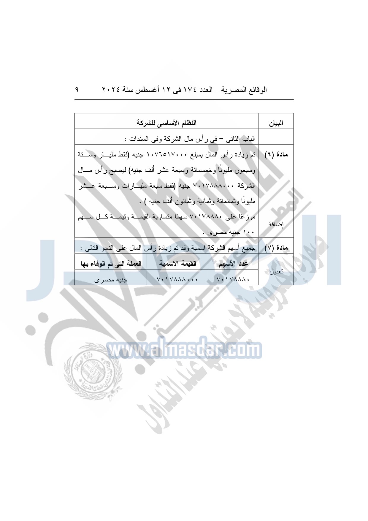 وأوضحت الوقائع المصرية، أن مجلس الإدارة وافق بالإجماع على زيادة رأس مال الشركة بمبلغ 1076517000 جنيه مصری "مليار وستة وسبعون مليونا وخمسمائة وسبعة عشر ألف جنيه" ليصبح رأس مال الشركة 7017888000 جنيه مصرى "سبعة مليارات وسبعة عشر مليونا وثمانمائة وثمانية وثمانون ألف جنيه".