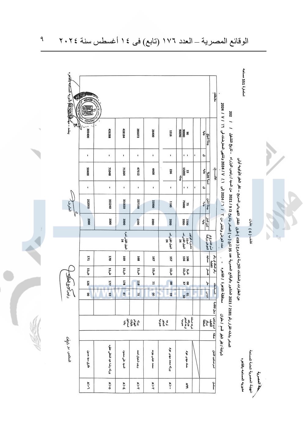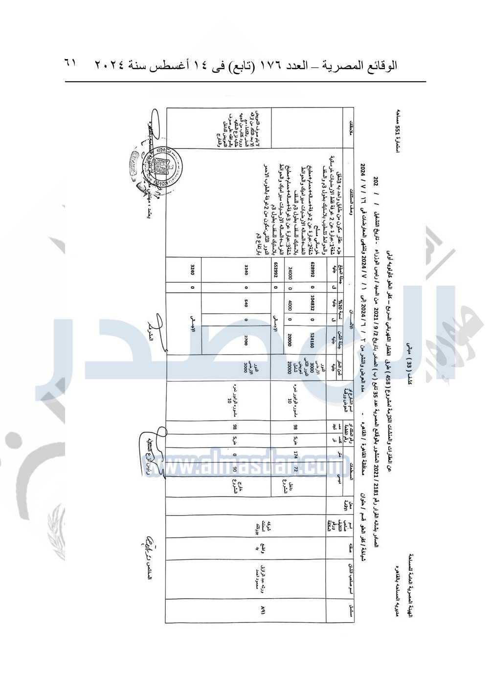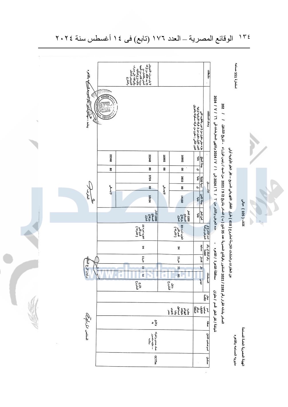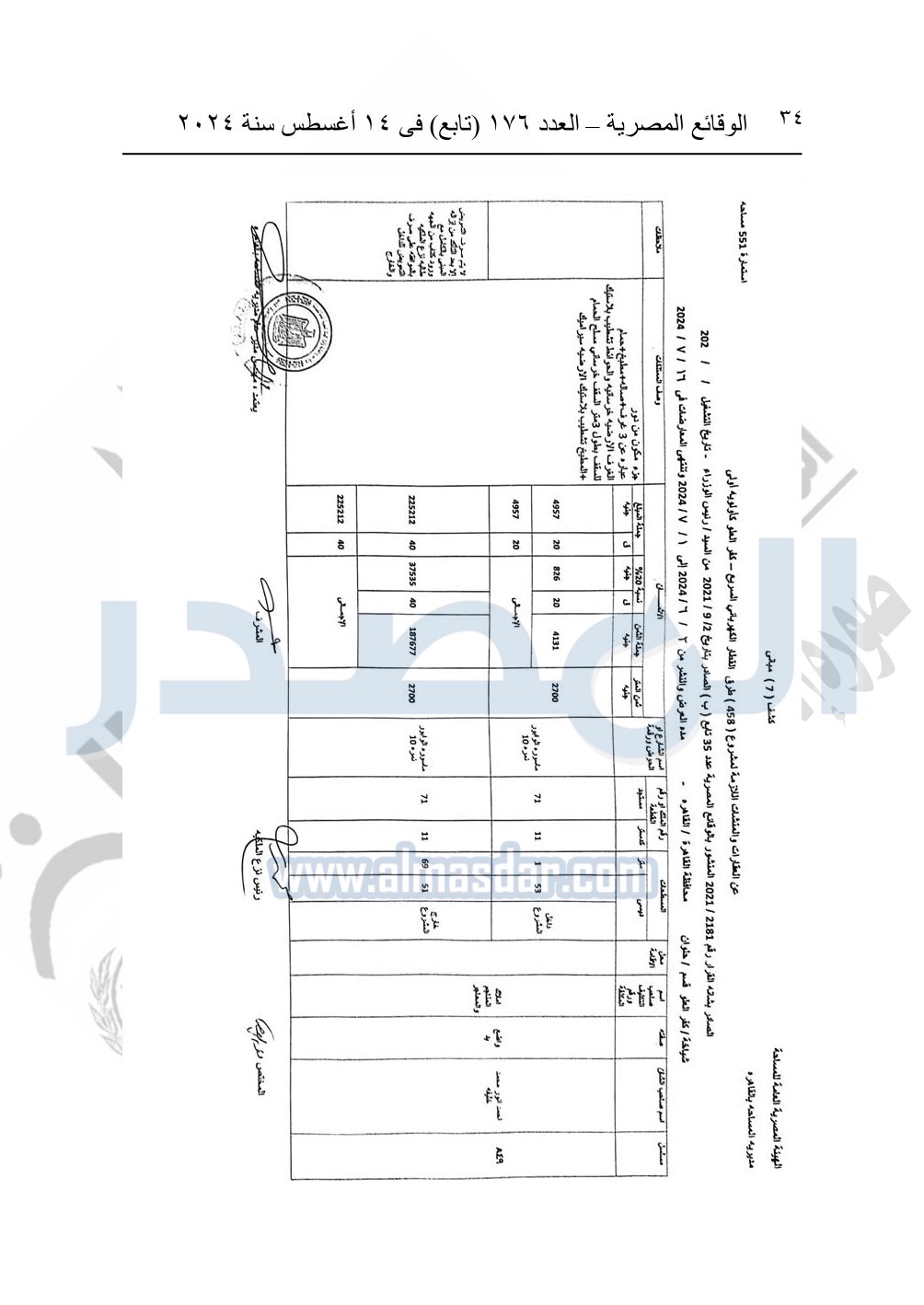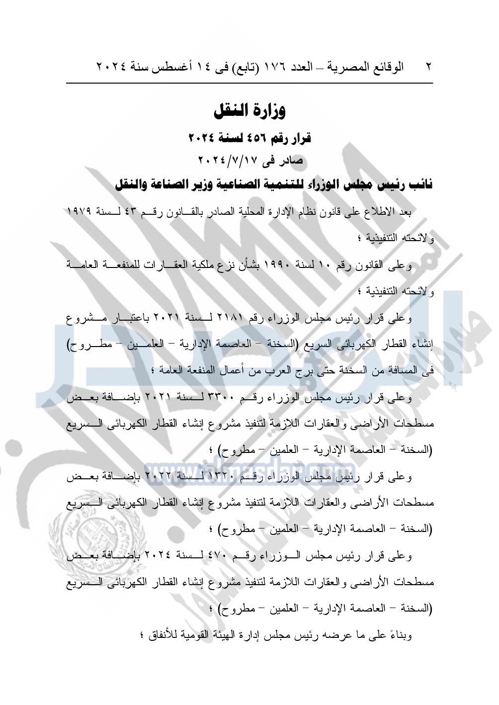 نشرت الوقائع المصرية في العدد 176 "تابع"، في 14 أغسطس 2024، قرار وزارة النقل رقم 456 لسنة 2024، صادر في 17-7-2024، بشأن نزع ملكية بعض الأراضي والعقارات لتنفيذ مشروع القطار الكهربائي السريع.