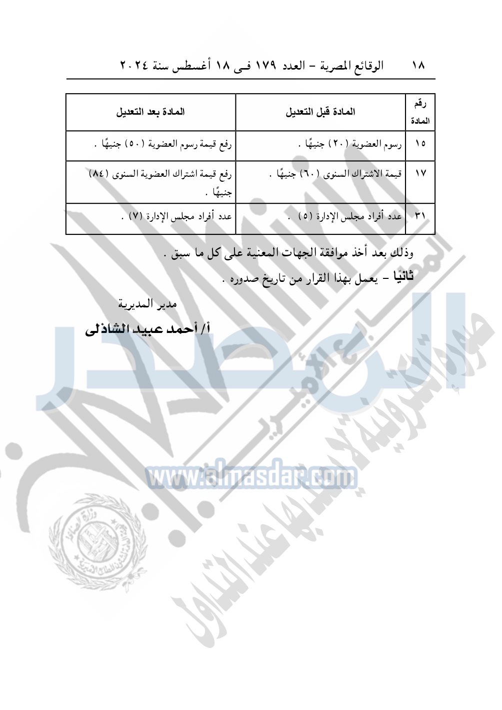 نشرت الوقائع المصرية في العدد 179، بتاريخ 18 أغسطس 2024، قرار إدارة روض الفرج لالتضامن الاجتماعي بالقاهرة، بشأن قرار تعديل الجمعية العمومية غير العادية لجمعية العاصمة للتدريب والتأهيل والتنمية بتاريخ 17-11-2023.