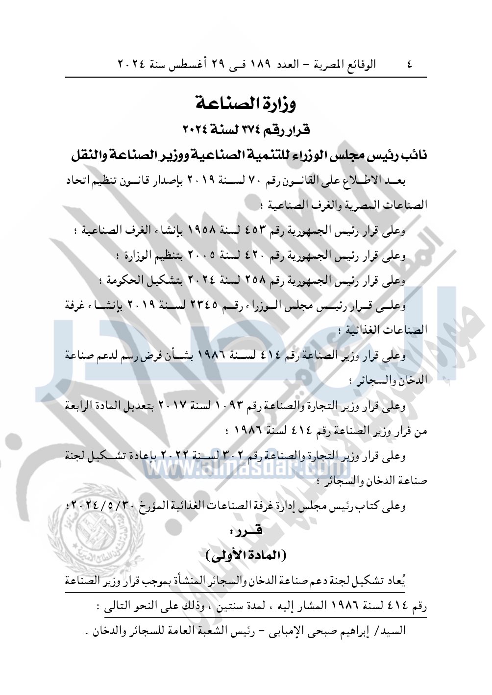 نشرت الوقائع المصرية في العدد 189، الصادر في 29 أغسطس سنة 2024، قرار وزارة الصناعة رقم 374 لسنة 2024، بشأن إعادة تشكيل لجنة دعم صناعة الدخان والسجائر لمدة سنتين.
