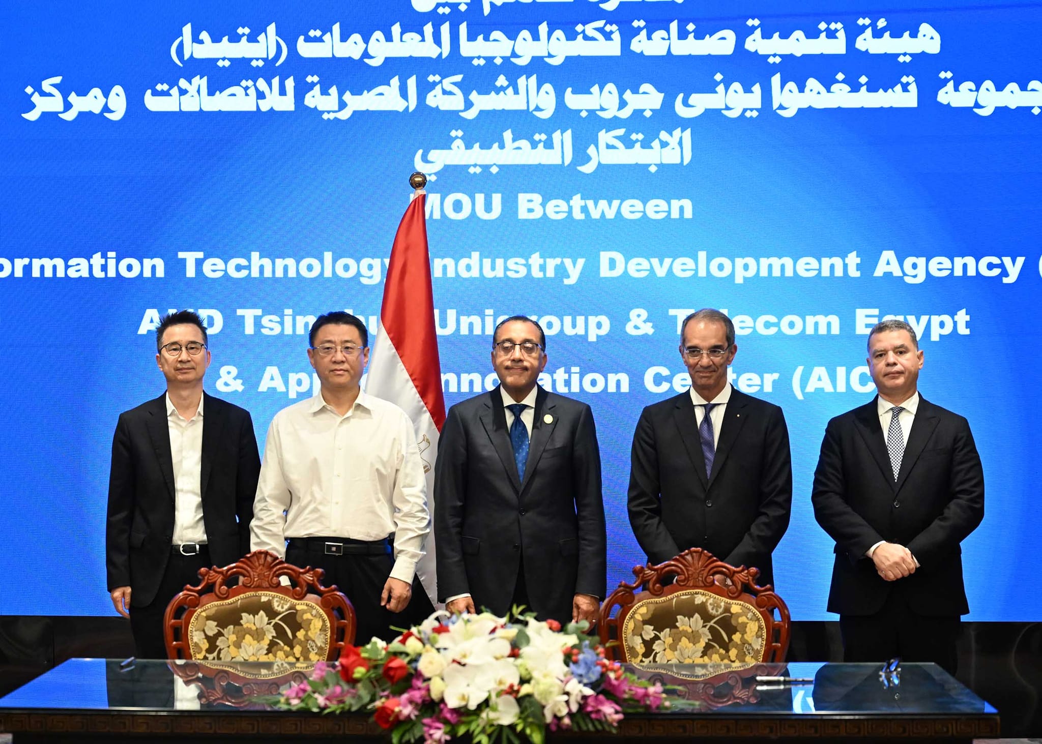 ووقع مذكرة التفاهم كل من: المهندس أحمد الظاهر، الرئيس التنفيذى لهيئة تنمية صناعة تكنولوجيا المعلومات "إيتيدا"، نيابة عن الهيئة، والشركة المصرية للاتصالات، ومركز الابتكار التطبيقي، ووقع عن مجموعة تسينغهوا يونى جروب، Jie chen، الرئيس المشارك لمجموعة.