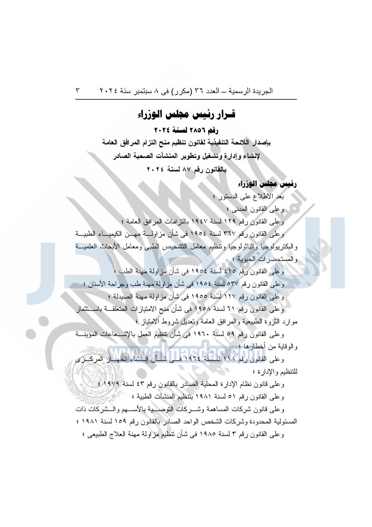 نشرت الجريدة الرسمية في العدد 36 "مكرر" الصادر في 8 سبتمبر سنة 2024، قرار رئيس مجلس الوزراء رقم 2856 لسنة 2024، بشأن إصدار اللائحة التنفيذية لقانون تنظيم منح التزام المرافق العامة لإنشاء وإدارة وتشغيل وتطوير المنشآت الصحية الصادر بالقانون رقم 87 لسنة 2024.