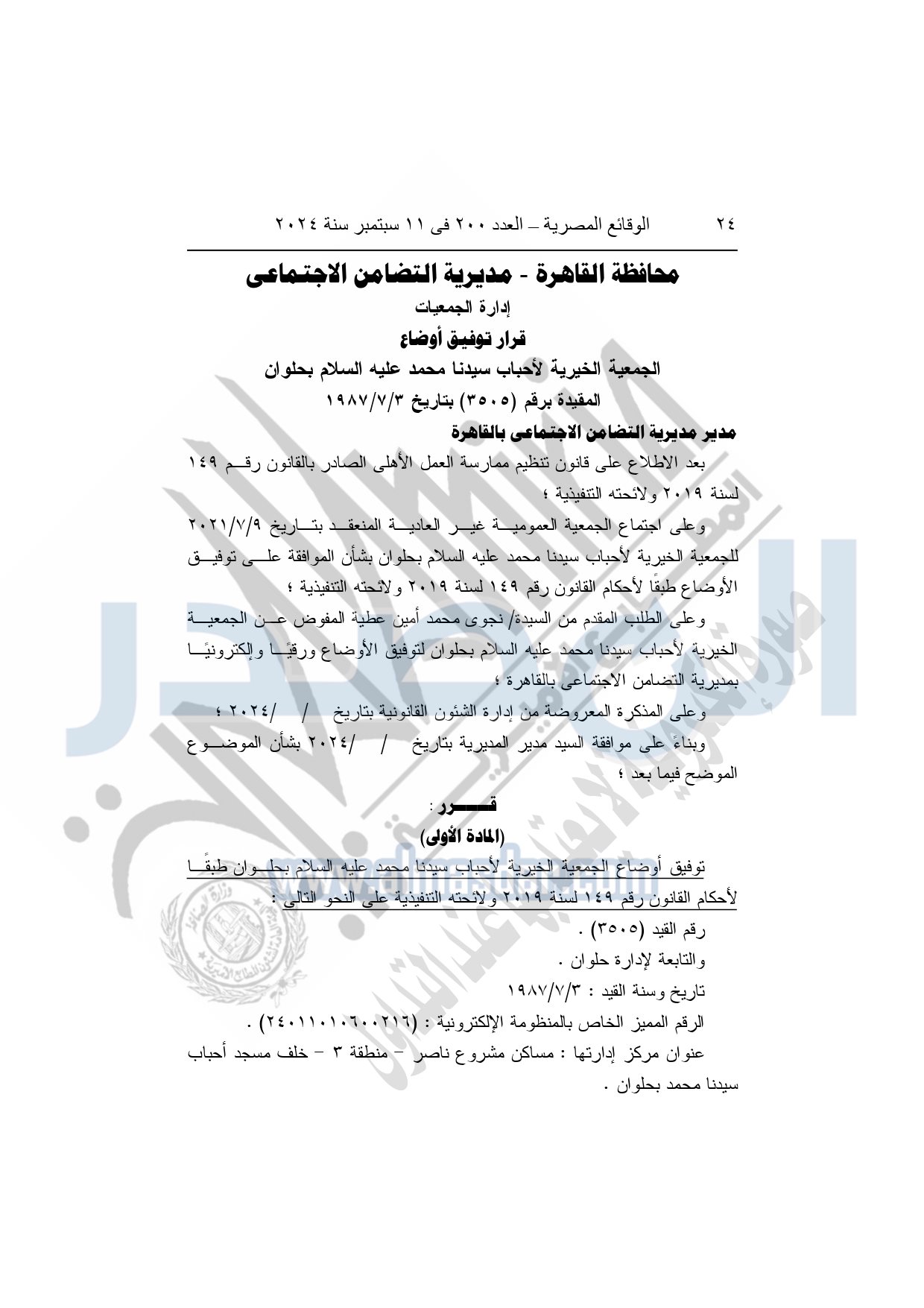 نشرت الوقائع المصرية في العدد 200، بتاريخ 11 سبتمبر 2024، قرار مديرية التضامن الاجتماعي بالقاهرة، بشأن توفيق أوضاع الجمعية الخيرية لأحباب سيدنا محمد عليه السلام بحلوان المقيدة برقم "3505" بتاريخ 3-7-1987.