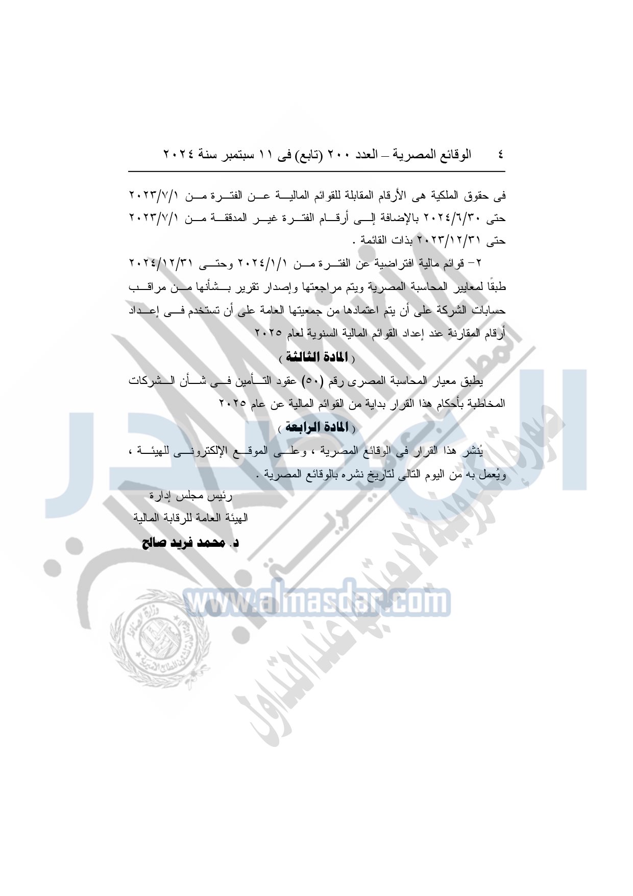 يطبق معيار المحاسبة المصرى رقم "50" عقود التأمين في شأن الشركات المخاطبة بأحكام هذا القرار بداية من القوائم المالية عن عام 2025.
