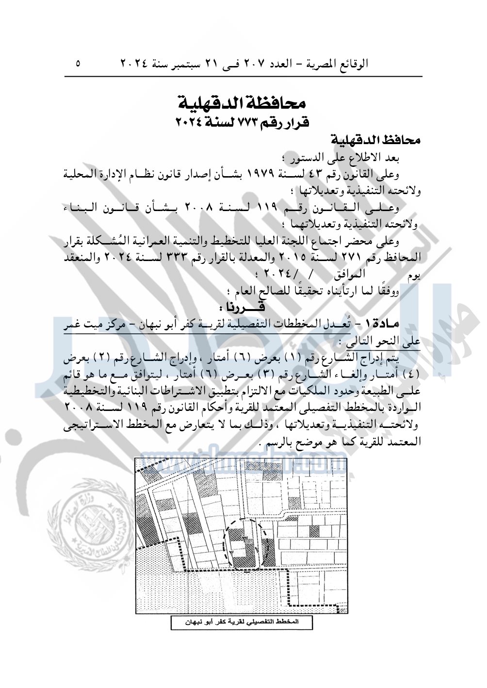 كما نشرت الوقائع المصرية في العدد 207، بتاريخ 21 سبتمبر 2024، قرار محافظة الدقهلية رقم 337 لسنة 2024، بشأن تعديل المخططات التفصيلية لقرية كفر أبو نبهان.