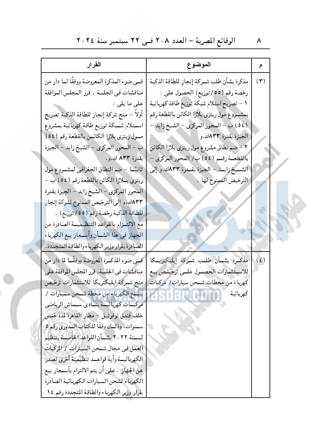 كما نشرت الوقائع المصرية في العدد 208، بتاريخ 22 سبتمبر 2024، قرارات مجلس إدارة جهاز تنظيم مرفق الكهرباء وحماية المستهلك، المجموعة الثانية الصادرة بالجلسة الثانية للعام المالي 2024-2025 المنعقدة بتاريخ 18-8-2024 بشأن منح وتجديد تصاريح - تراخيص إنتاج - توزيع وبيع طاقة كهربائية وضم بعض النطاقات الجغرافية.
