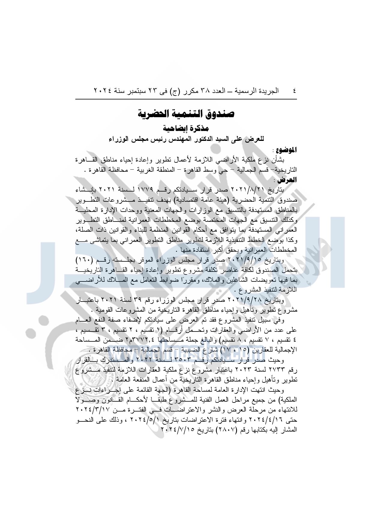 وأضافت الجريدة الرسمية، أن القرار جاء بعد الإطلاع أيضا على قرار رئيس مجلس الوزراء رقم 1779 لسنة 2021 بشأن إنشاء صندوق التنمية الحضرية؛ وعلى قرار رئيس مجلس الوزراء رقم 3503 لسنة 2022 باعتبار مشروع نزع ملكية العقارات اللازمة لتنفيذ مشروع تطوير وتأهيل وإحياء مناطق القاهرة التاريخية من أعمال المنفعة العامة المعدل بالقرار رقم 2733 لسنة 2023؛ وبناءً على ما عرضه رئيس مجلس إدارة صندوق التنمية الحضرية.