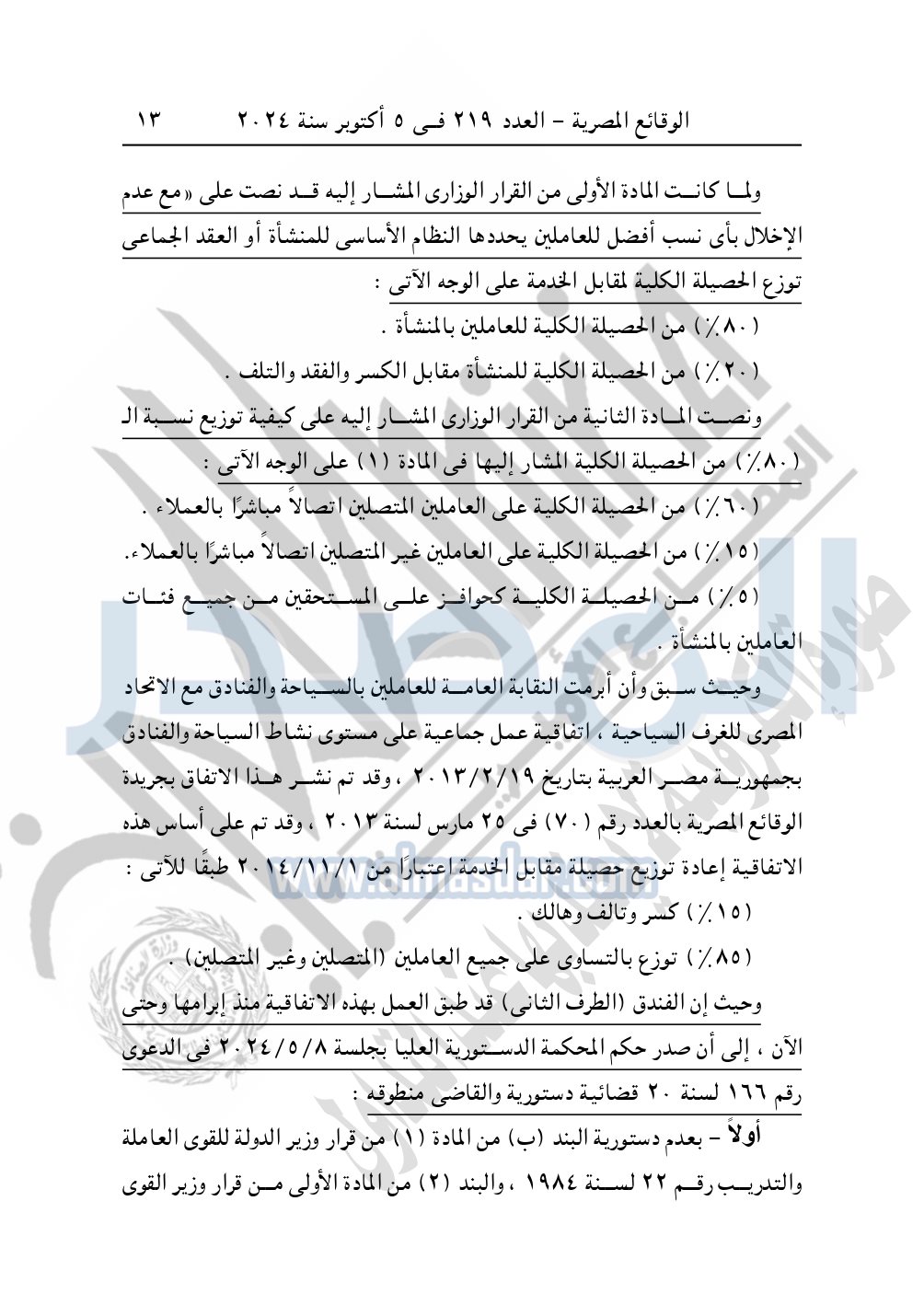 ونفاذا لذلك صدر قرار وزير القوى العاملة والهجرة رقم 125 لسنة 2003 بشأن نسب توزيع حصيلة مقابل الخدمة فى المنشآت الفندقية والسياحية.