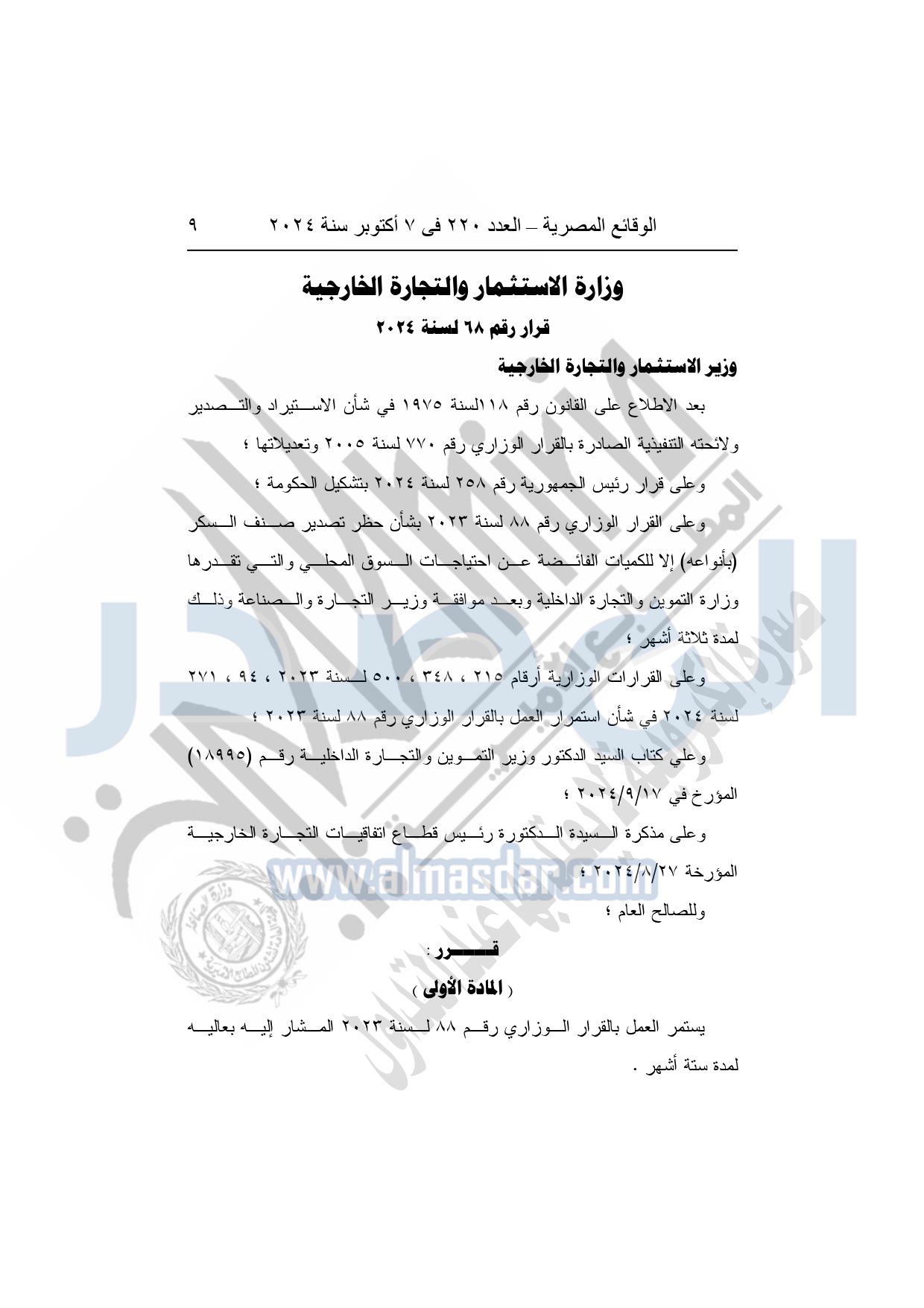 نشرت الوقائع المصرية في العدد 220، في 7 أكتوبر 2024، قرار وزارة الاستثمار والتجارة الخارجية، رقم 68 لسنة 2024، بشأن استمرار حظر تصدير السكر لمدة 6 أشهر.