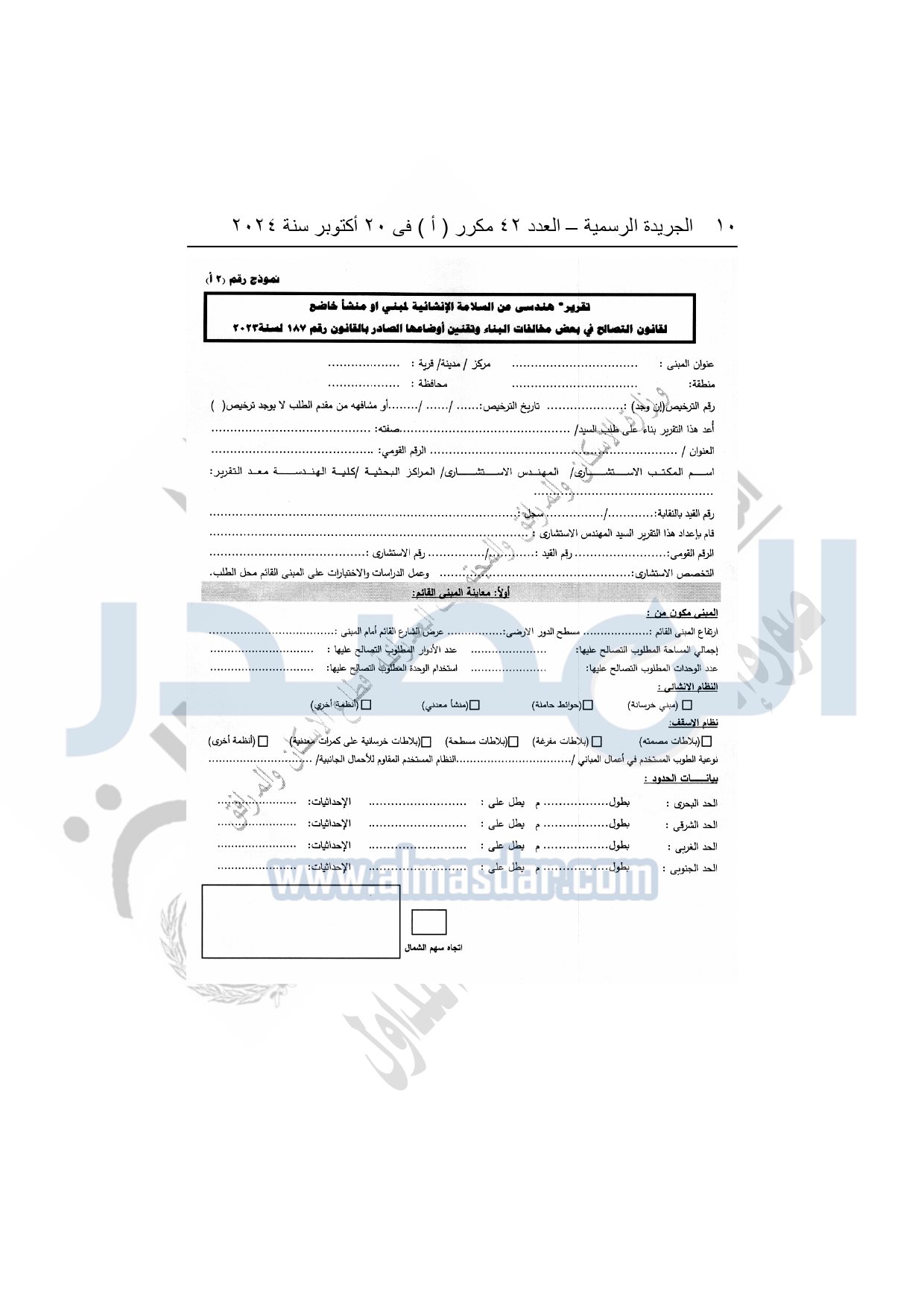 ويكتفي بتقرير من مهندس مقيد بنقابة المهندسين متى كانت مساحة المبنى محل المخالفة لا تزيد عن مائتى متر مربع ولا يجاوز ارتفاعه ثلاثة أدوار، وفقًا للنموذج رقم "2ب" المرافق لهذه اللائحة.
