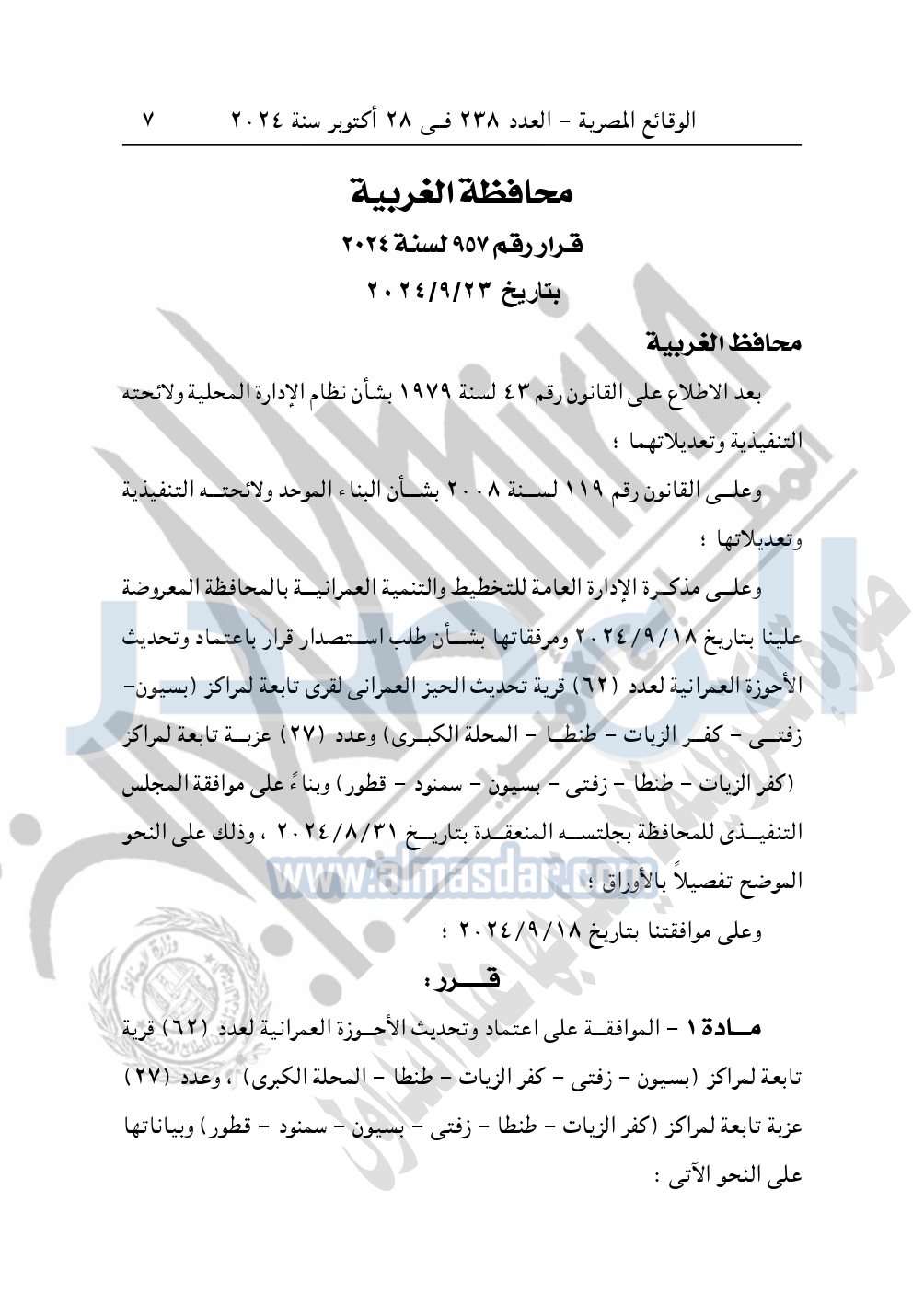 نشرت الوقائع المصرية في العدد 238، في 28 أكتوبر 2024، قرار محافظة الغربية رقم 957 لسنة 2024، بتاريخ 23-9-2024، بشأن الموافقة على اعتماد وتحديث الأحوزة العمرانية لعدد "62" قرية بمحافظة الغربية.