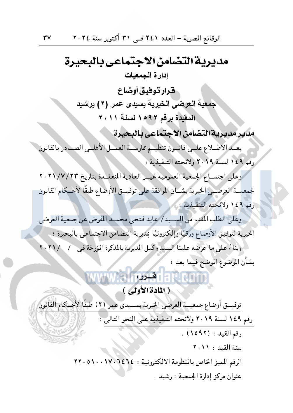 ونشرت الوقائع المصرية في العدد 241، في 31 أكتوبر 2024، قرار مديرية التضامن الاجتماعي بالبحيرة، بشأن توفيق أوضاع جمعية العرضي الخيرية بسيدي عمر "2" برشيد، المقيدة برقم "1592" لسنة 2011.