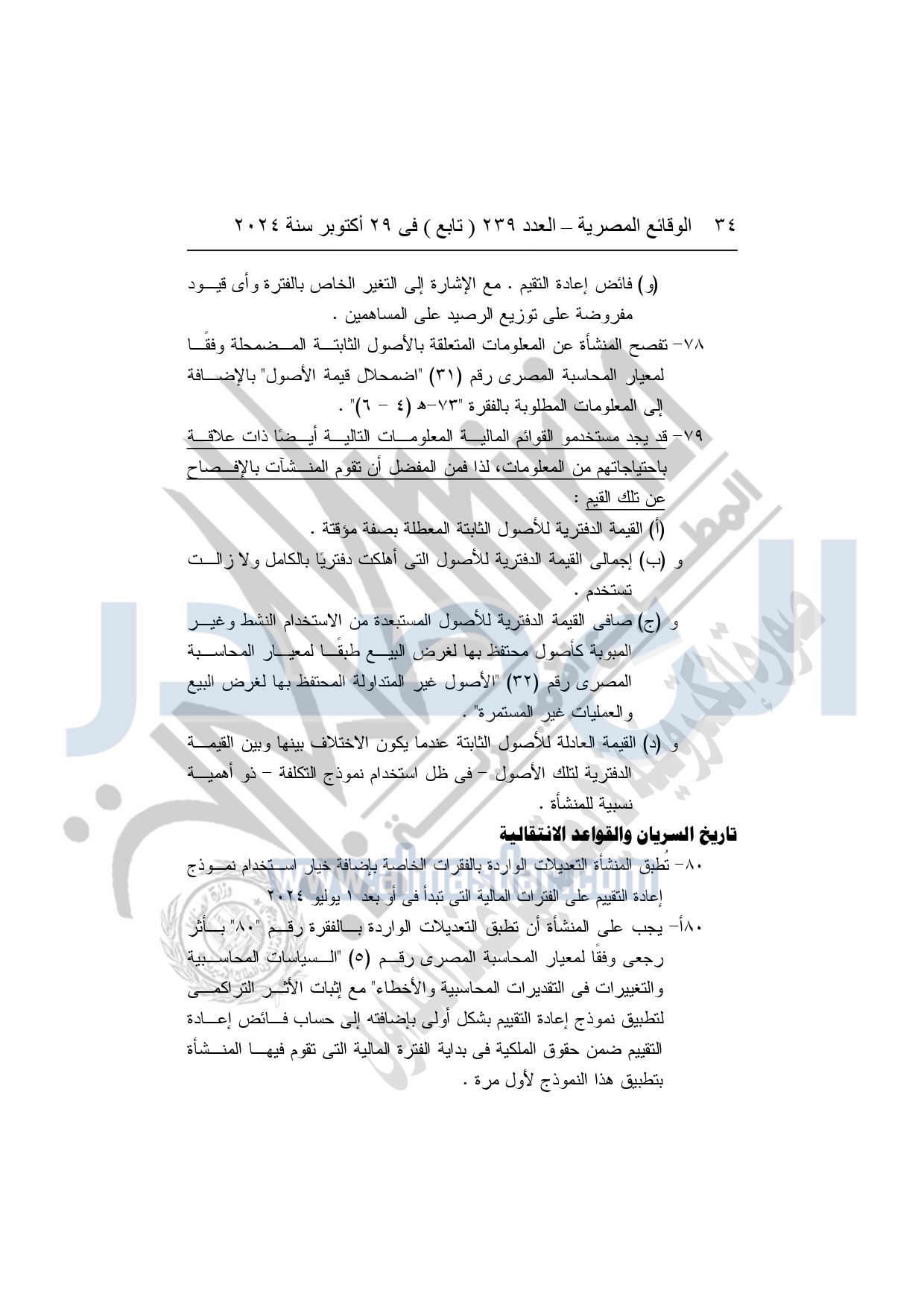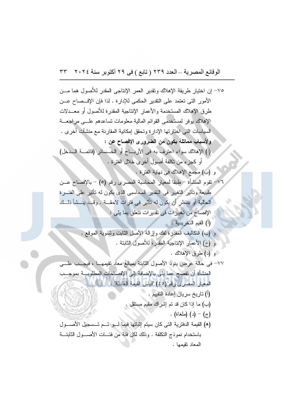 نشرت الوقائع المصرية في العدد 239 "تابع"، في 29 أكتوبر 2024، قرار الجهاز المركزى للمحاسبات رقم 1748 لسنة 2024، بشأن تعديل معيار المحاسبة عن الأصول الثابتة وإهلاكاتها بالنظام المحاسبي الموحد.
