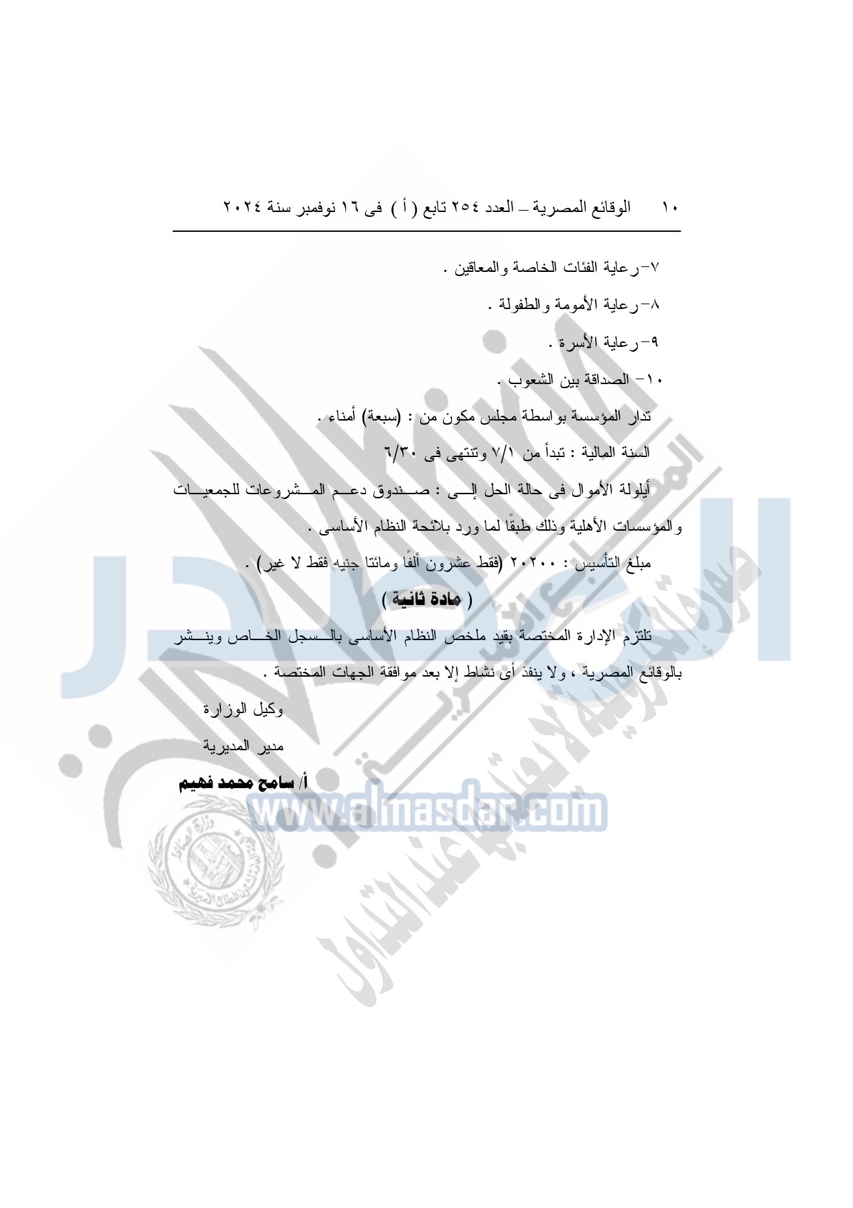 كما نشرت الوقائع المصرية في العدد 254 تابع "أ"، بتاريخ 16 نوفمبر 2024، قرار مديرية التضامن الاجتماعي بمحافظة الشرقية، الخاص بقيد رقم 3857، بشأن قيد لائحة النظام الأساسي لمؤسسة شمس الأصيل الخيرية بمنيا القمح.