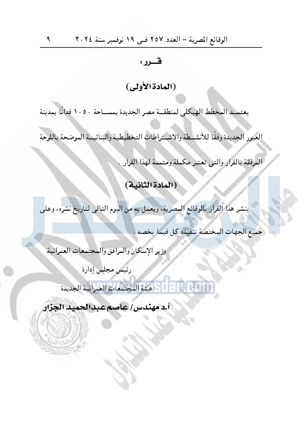 يعتمد مخطط الهيكلي لمنطقة مصر الجديدة بمساحة 1050 فداناً بمدينة العبور الجديدة وفقًا للأنشطة والاشتراطات التخطيطية والبنائية الموضحة باللوحة المرفقة بالقرار والتي تعتبر مكملة ومتممة لهذا القرار.