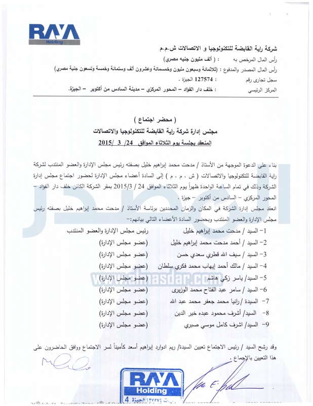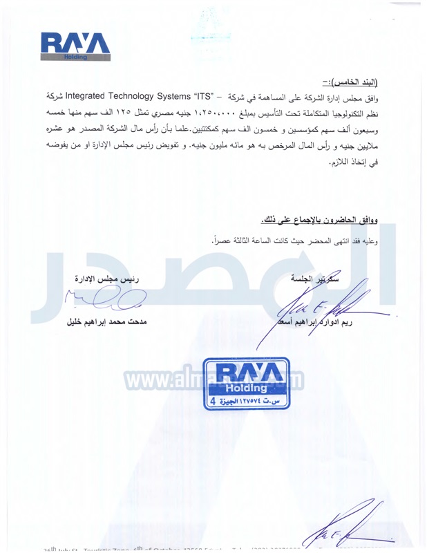 هذا وقد وافق مجلس ادارة "راية القابضة" المساهمة فى شركة-" integrated technology systems "ITS شركة نظم التكنولوجيا المتكاملة "تحت التاسيس" بمبلغ 1,250,000جنيه مصرى تمثل 125 الف سهم.