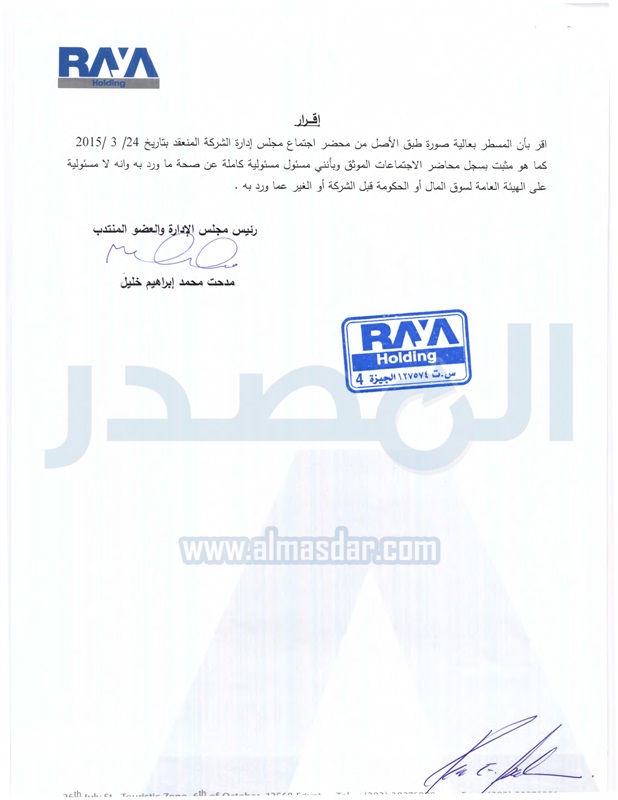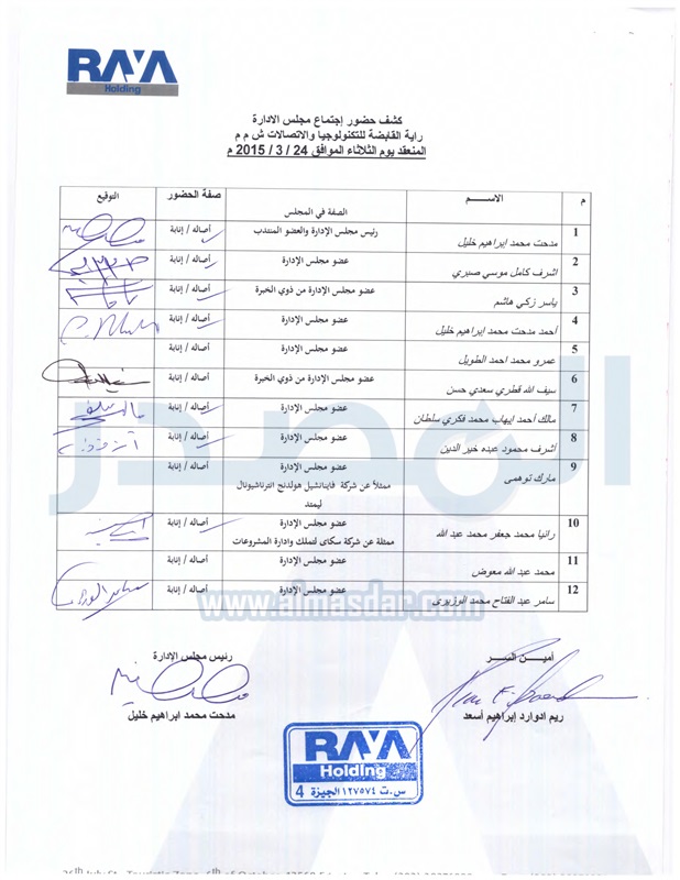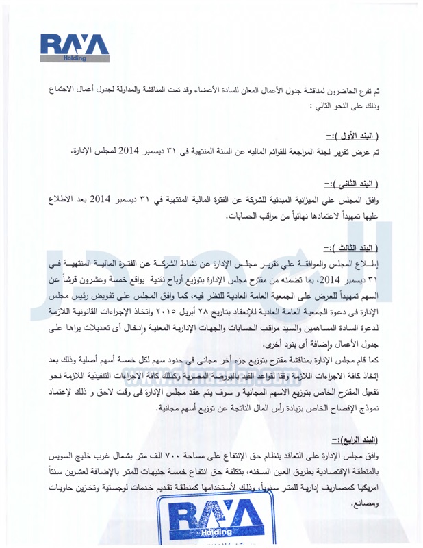 وافق مجلس ادارة شركة راية القابضة للاتصالات وتكنولوجيا المعلومات على الميزانية المبدئية عن السنة المالية المنتهية فى 31 ديسمبر 2014 تمهيدا لاعتمادها نهائيا من مراقب الحسابات.