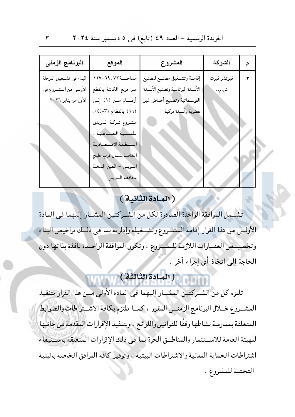 نشرت الجريدة الرسمية في العدد 49 "تابع" الصادر في 5 ديسمبر 2024، قرار مجلس الوزراء رقم 69 لسنة 2024، بشأن الموافقة على منح شركتى أوبيليسك للطاقة الشمسية وفيوتشر فيرت الرخصة الذهبية أو ما يسمى بالموافقة الواحدة المنصوص عليها بالمادة "20" من قانون الاستثمار.