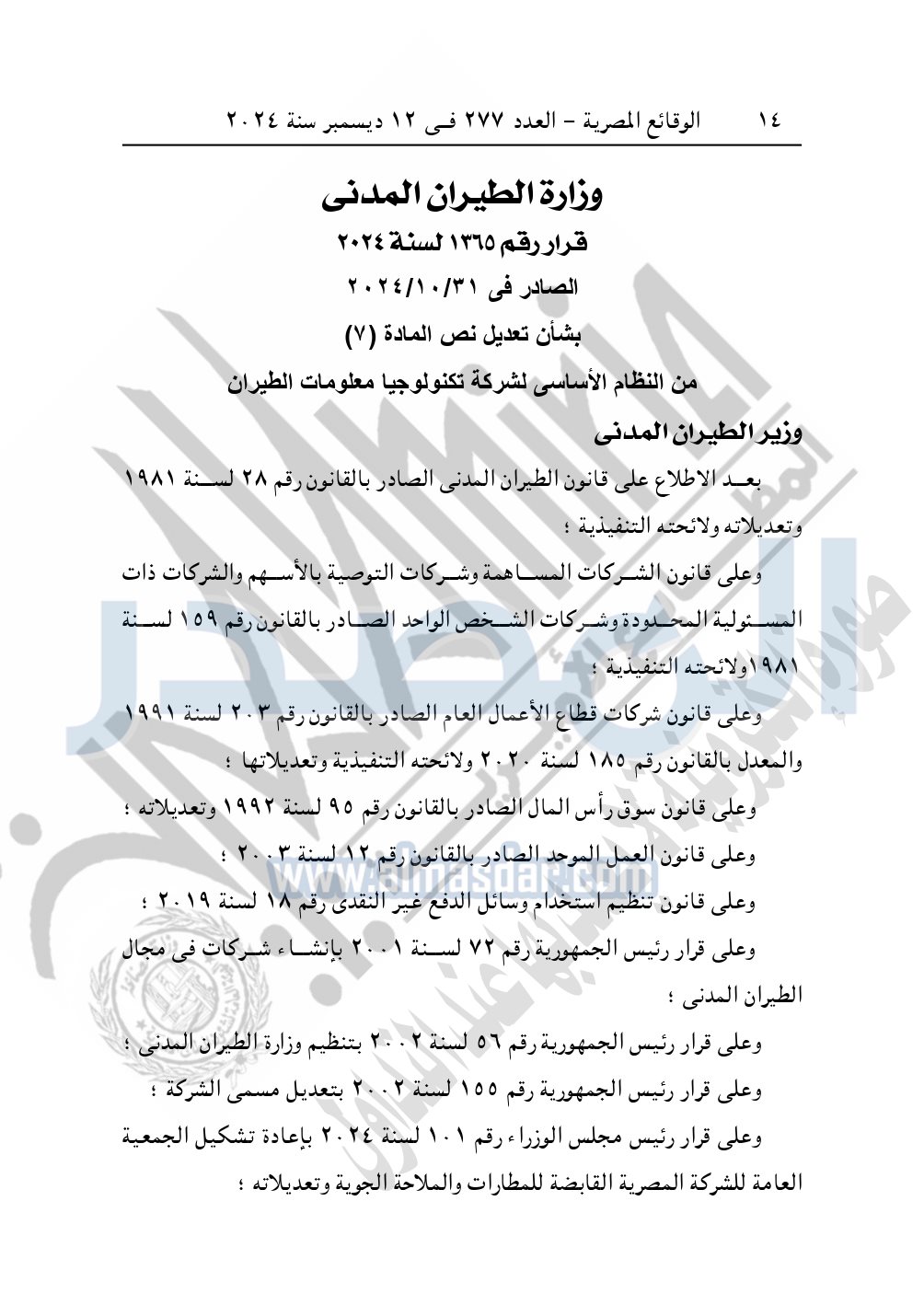 نشرت الوقائع المصرية في العدد 277، بتاريخ 12 ديسمبر 2024، قرار وزارة الطيران المدنى، رقم 1365 لسنة 2024، بتاريخ 31-10-2024، بشأن تعديل نص المادة "7" من النظام الأساسي لشركة تكنولوجيا معلومات الطيران.