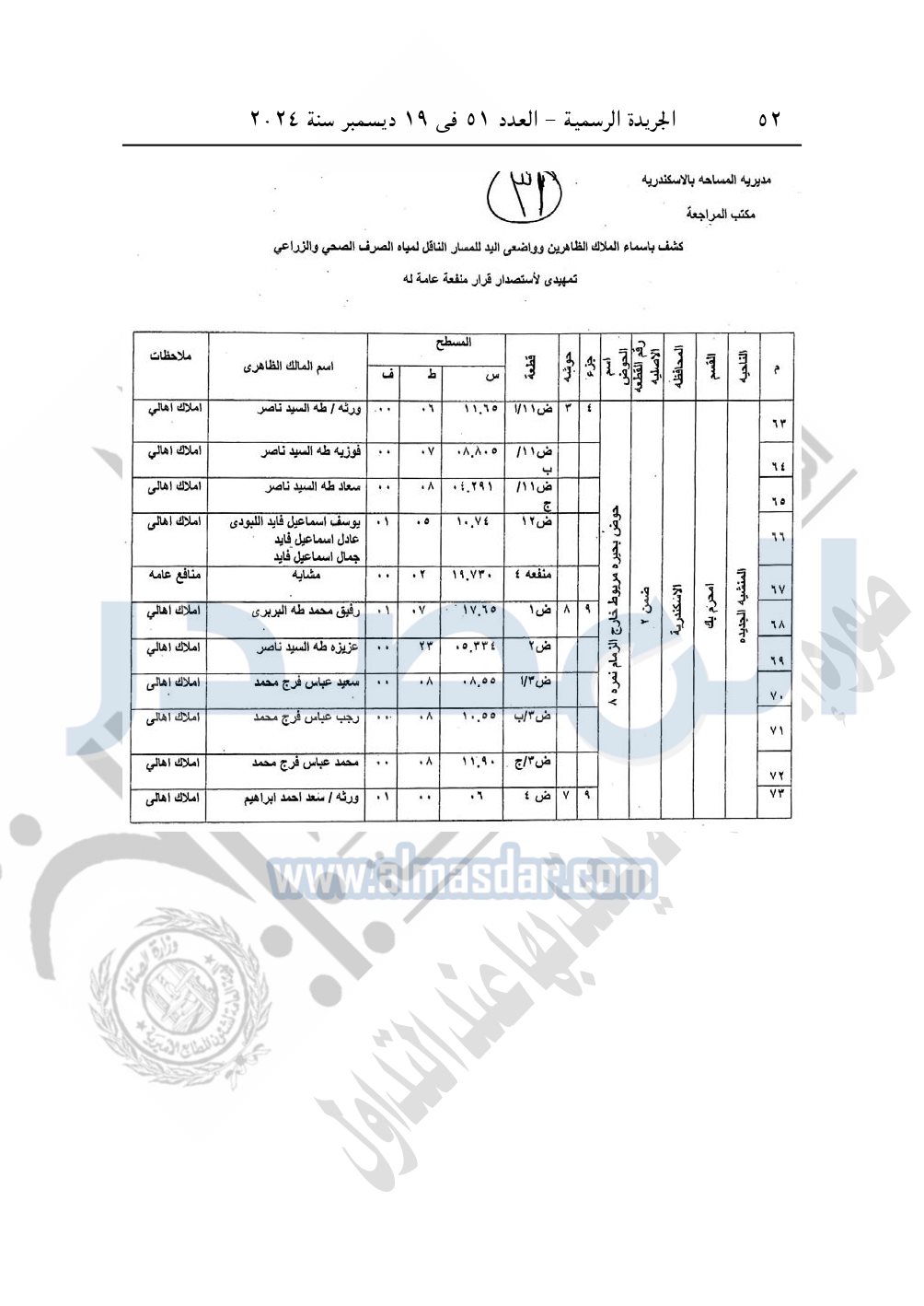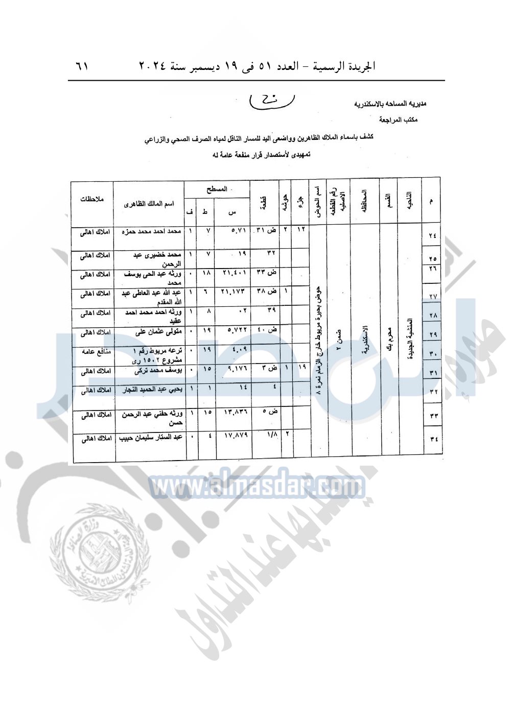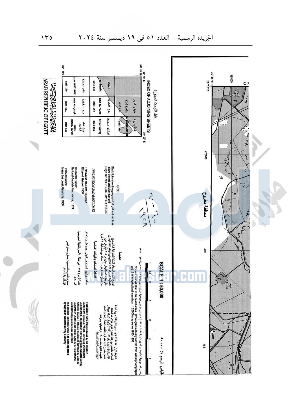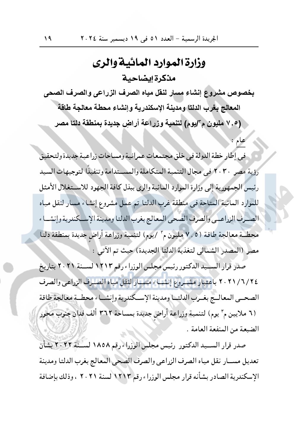 نشرت الجريدة الرسمية في العدد 51، الصادر في 19 ديسمبر 2024، قرار مجلس الوزراء رقم 3928 لسنة 2024، بشأن نزع ملكية بعض الأراضي لتنفيذ مشروع إنشاء مسار لنقل مياه الصرف الزراعي والصرف الصحي.
