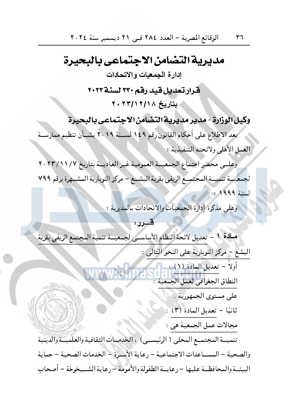 ونشرت الوقائع المصرية في العدد 284، بتاريخ 21 ديسمبر 2024، قرار مديرية التضامن الاجتماعي بمحافظة البحيرة، بشأن قرار تعديل لائحة النظام الأساسي لجمعية تنمية المجتمع الريفي والمقيدة برقم 330 لسنة 2023، بتاريخ 18-12-2023.