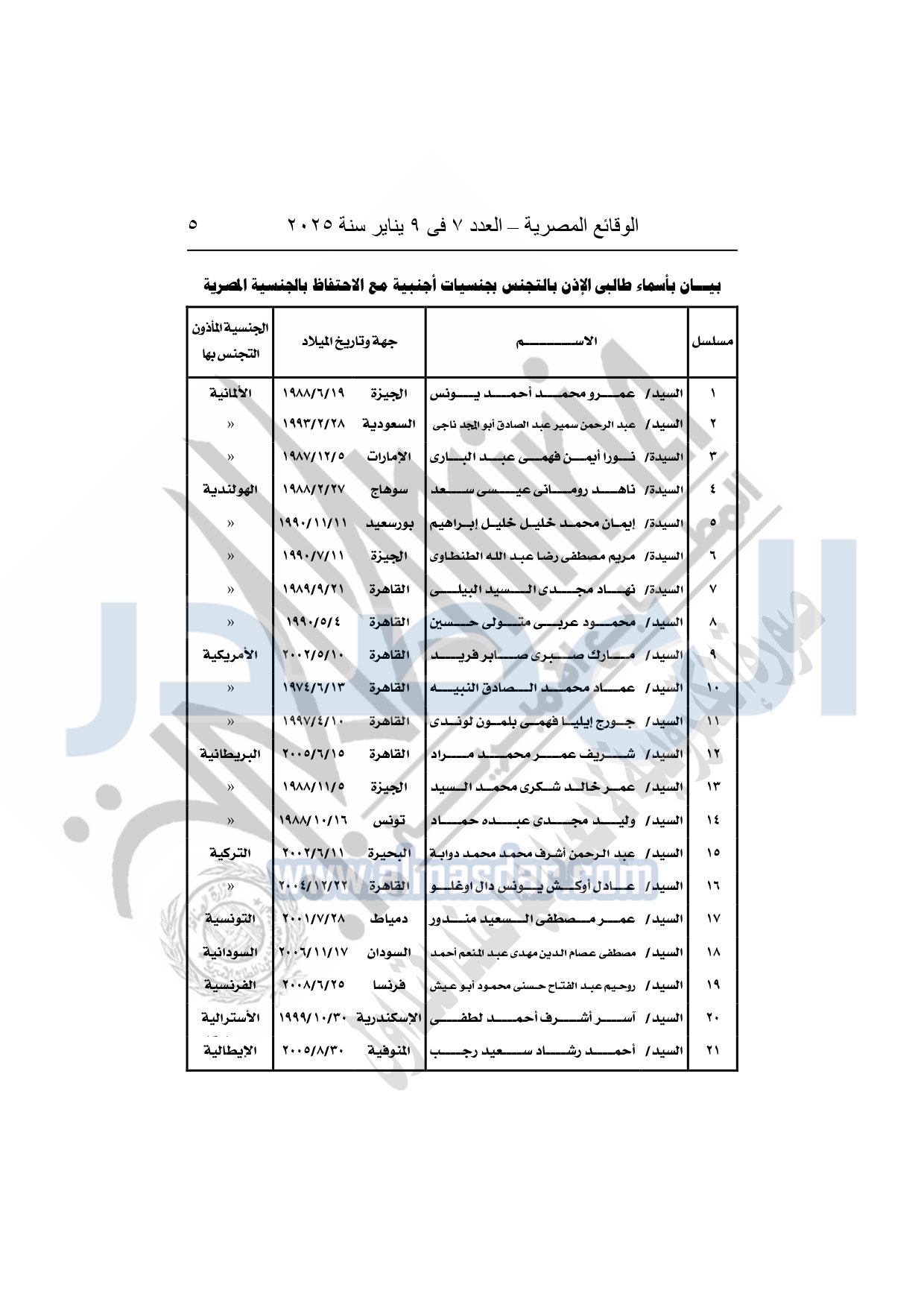 كما نشرت الوقائع المصرية في العدد 7، الصادر في 9 يناير سنة 2025، قرار وزارة الداخلية رقم 2441 لسنة 2024، بشأن الأذن لواحد وعشرين مواطن بالتجنس بالجنسية الأجنبية مع احتفاظهم بالجنسية المصرية.