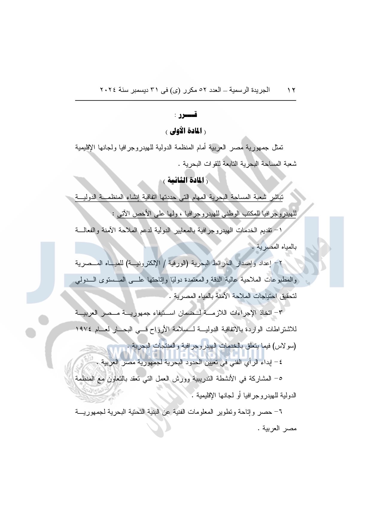 نشرت الجريدة الرسمية في العدد 52 مكرر "ى" الصادر في 31 ديسمبر سنة 2024، قرار رئيس جمهورية مصر العربية رقم 641 لسنة 2024، بشأن تمثيل شعبة المساحة البحرية لجمهورية مصر العربية أمام المنظمة الدولية للهيدروجرافيا.