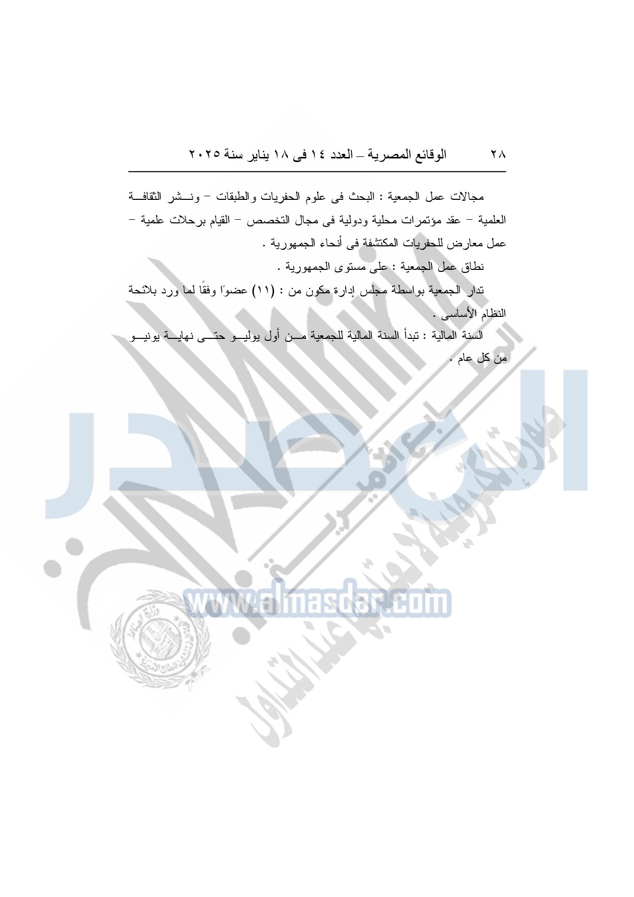 ونشرت الوقائع المصرية في العدد 14، بتاريخ 18 يناير 2025، قرار مديرية التضامن الاجتماعي بالوادي الجديد، الخاص بقيد رقم 344 لسنة 2024، بتاريخ 8-12-2024، بشأن قيد الجمعية المصرية لعلوم الحفريات والطبقات.