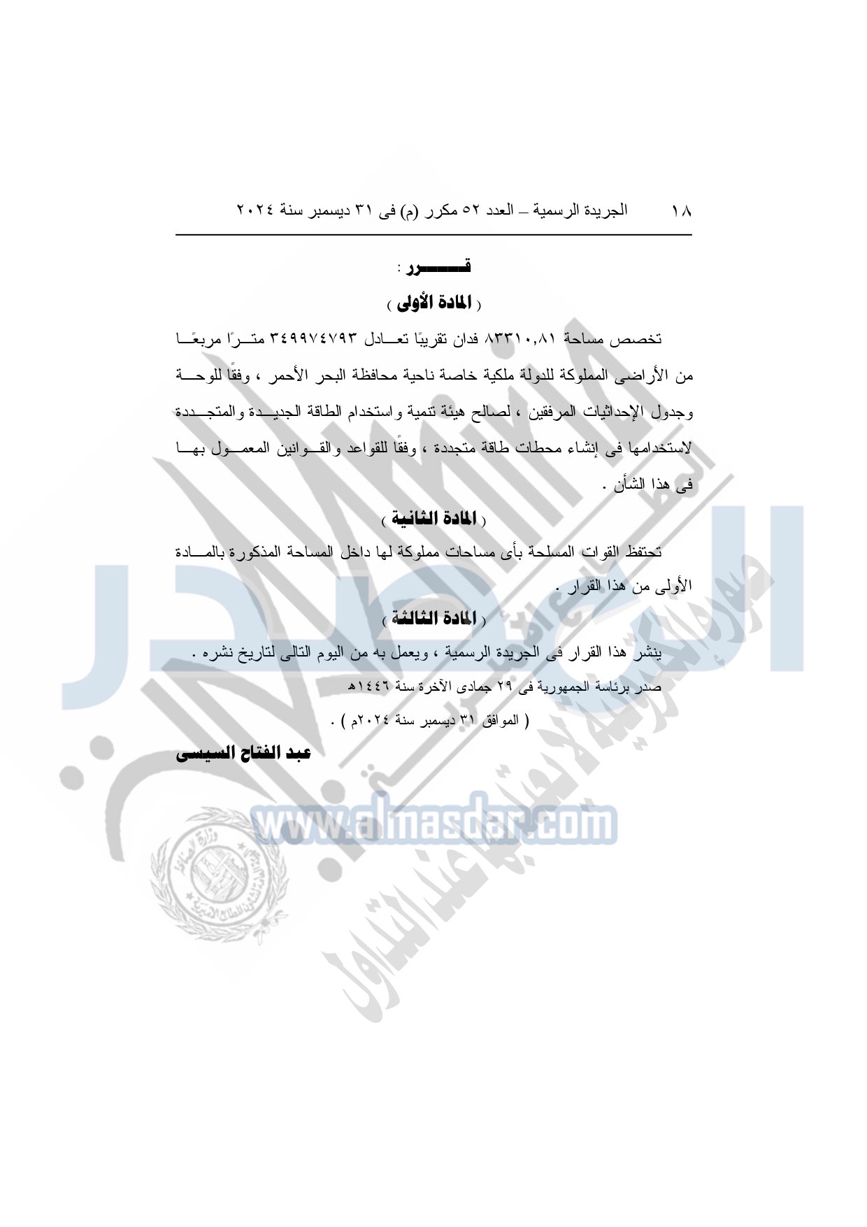 تخصص مساحة 83310.81 فدان تقريبًا تعادل 349974793 مترا مربعًا من الأراضي المملوكة للدولة ملكية خاصة ناحية محافظة البحر الأحمر، وفقا للوحة وجدول الإحداثيات المرفقين، لصالح هيئة تنمية واستخدام الطاقة الجديدة والمتجددة لاستخدامها في إنشاء محطات طاقة متجددة، وفقًا للقواعد والقوانين المعمول بها هذا الشأن.