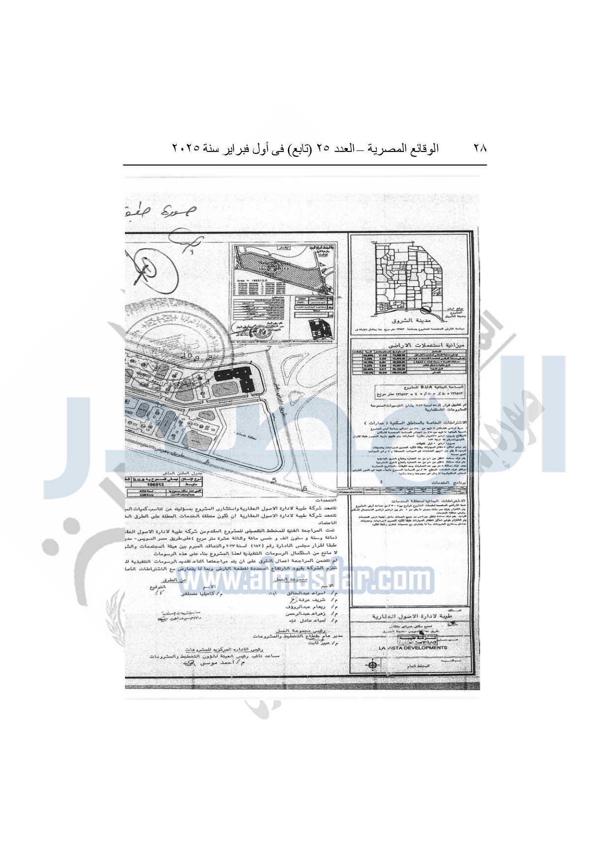 نشرت الوقائع المصرية في العدد 25 "تابع"، في أول فبراير 2025، قرار وزارة الإسكان والمرافق والمجتمعات العمرانية، رقم 659 لسنة 2024، بتاريخ 14-7-2024 بشأن اعتماد تخطيط وتقسيم قطعة الأرض بمساحة 39.645 فدان بما يعادل "166513م2" الكائنة على طريق مصر السويس بمدينة الشروق المخصصة لـ شركة طيبة لإدارة الأصول العقارية بنظام السداد النقدى والعينى لإقامة مشروع عمراني متكامل.