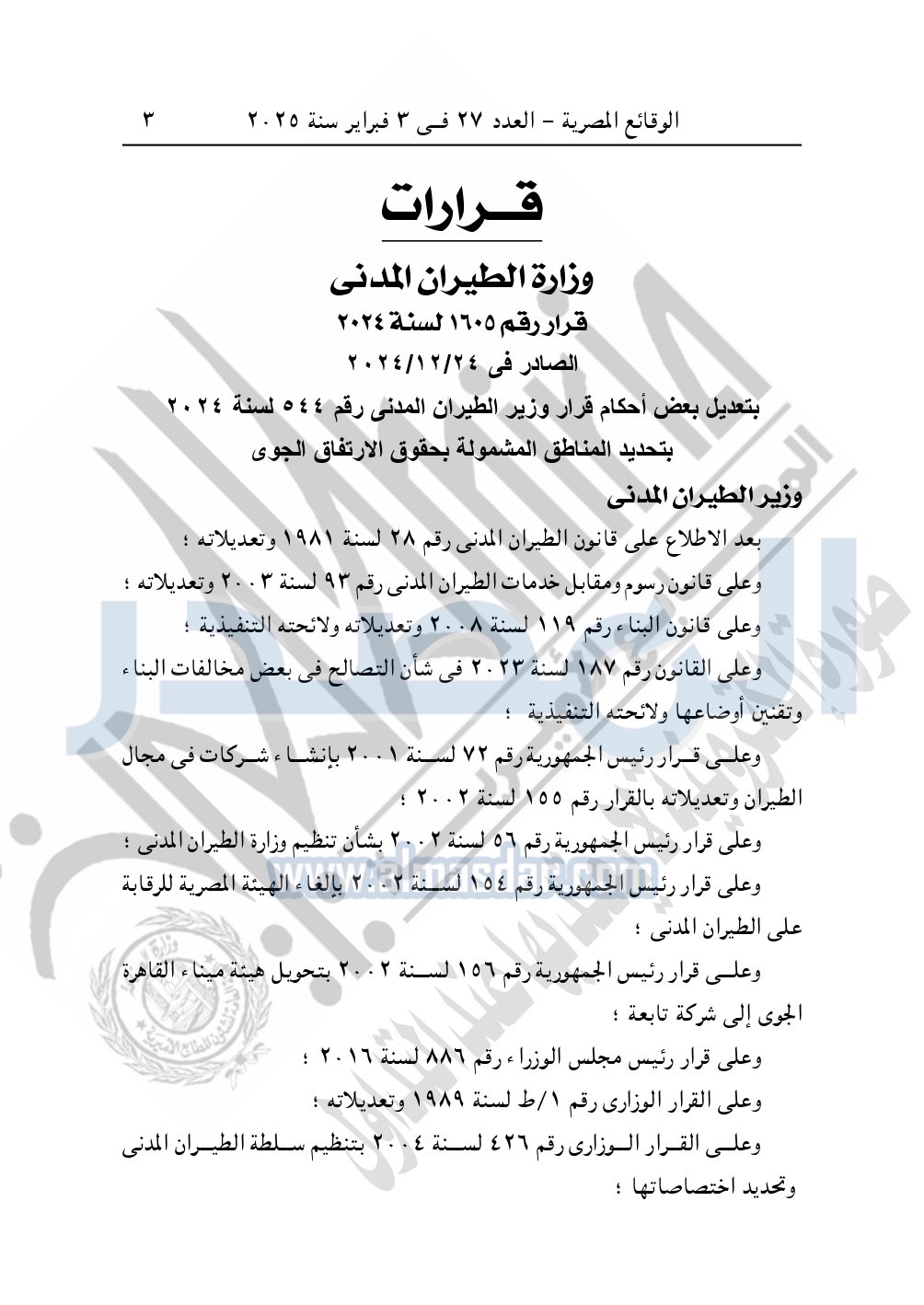 نشرت الوقائع المصرية في العدد 27، في 3 فبراير 2025، قرار وزارة الطيران المدنى، رقم 1605 لسنة 2024، الصادر في 24-12-2024، بشأن تعديل بعض أحكام قرار وزير الطيران المدنى رقم 544 لسنة 2024 بتحديد المناطق المشمولة بحقوق الارتفاق الجوى.
