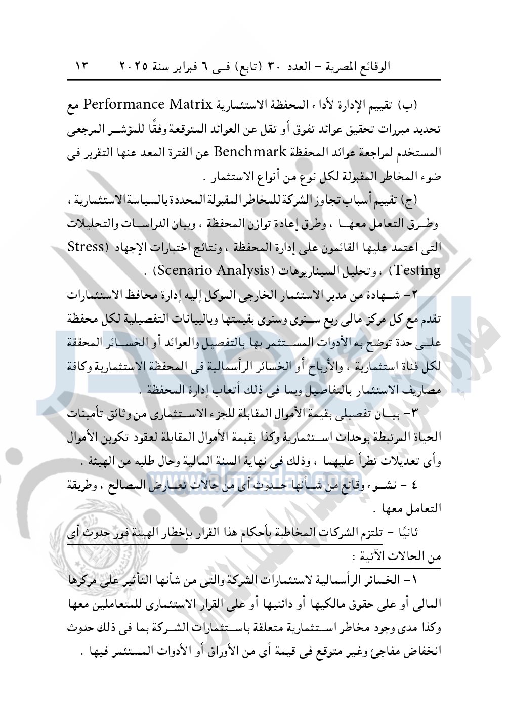 نشرت الوقائع المصرية في العدد 30 "تابع"، في 6 فبراير 2025، قرار الهيئة العامة للرقابة المالية رقم 2 لسنة 2025، بشأن قواعد وضوابط ونسب استثمار أموال شركات التأمين وإعادة التأمين.