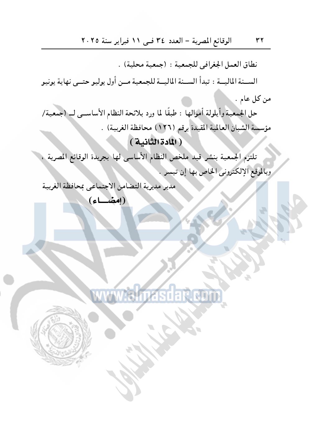 كما نشرت الوقائع المصرية في العدد 34، بتاريخ 11 فبراير 2025، قرار مديرية التضامن الاجتماعي بالجيزة، الخاص بقيد رقم 7694 لسنة 2024، بتاريخ 29-7-2024، بشأن قيد جمعية الأزدهار لخدمة وتنمية المجتمع.