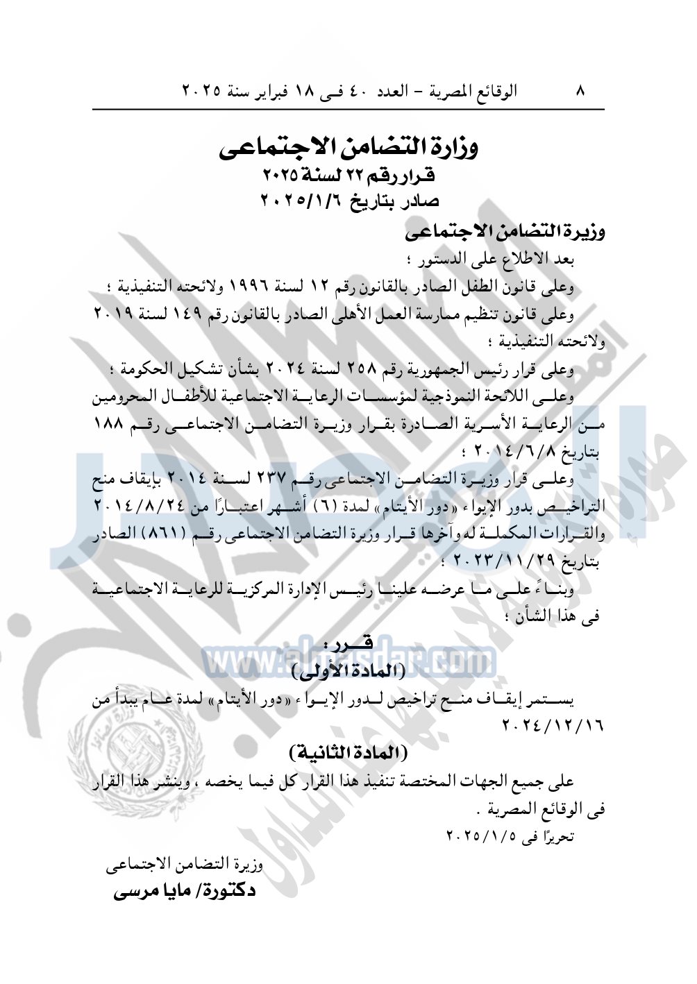 نشرت الوقائع المصرية في العدد 40، بتاريخ 18 فبراير 2025، قرار وزارة التضامن الاجتماعي، رقم 22 لسنة 2025، صادر بتاريخ 6-1-2025، بشأن استمرار إيقاف منح تراخيص لدور الإيواء «دور الأيتام» لمدة عام.