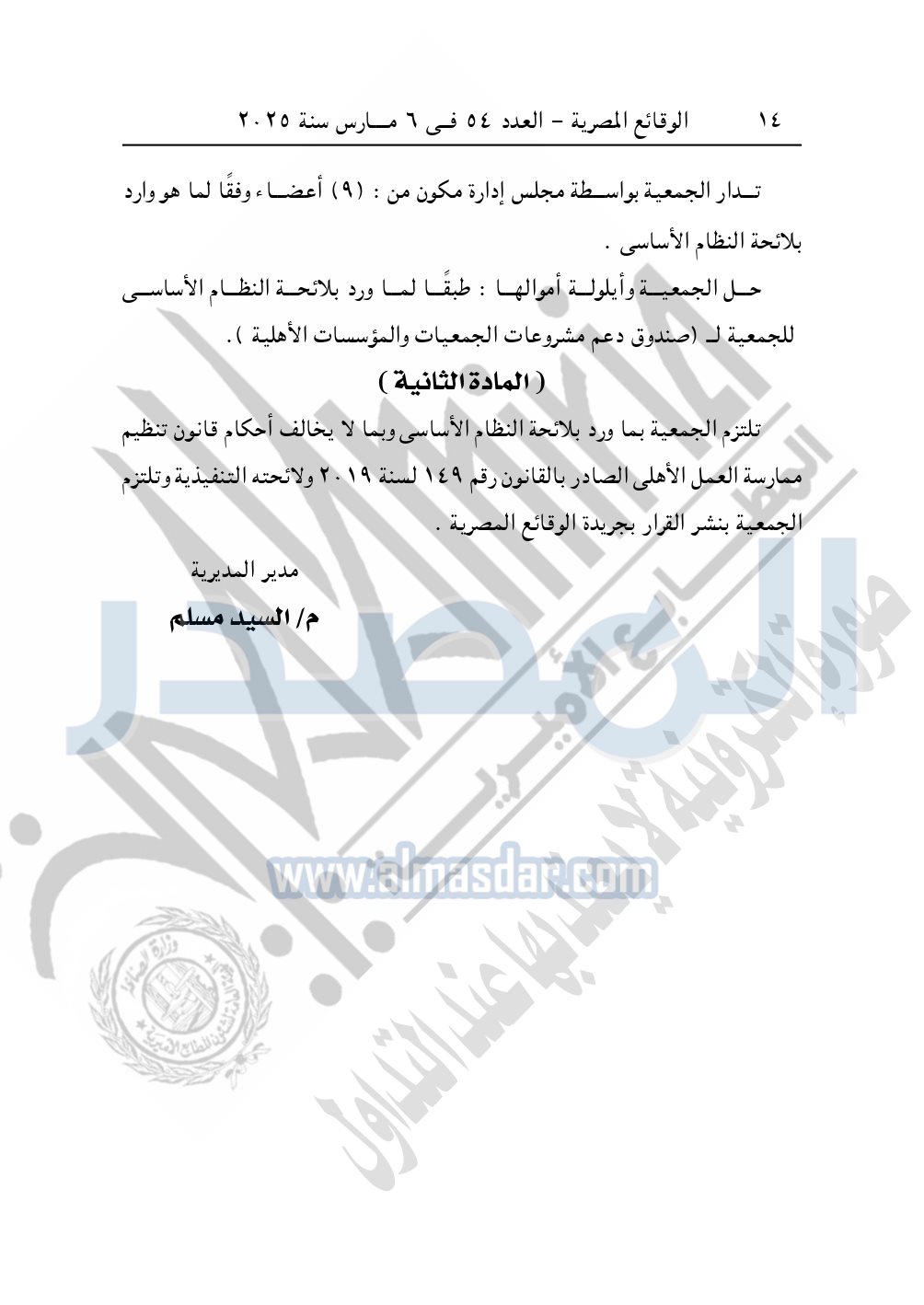 كما نشرت الوقائع المصرية في العدد 54، بتاريخ 6 مارس 2025، قرار مديرية التضامن الاجتماعي بكفر الشيخ، الخاص بقيد رقم 2437 لسنة 2024، بتاريخ 25-12-2024، بشأن قيد جمعية العلم والإيمان الخيرية بـ"أبو مصطفى".