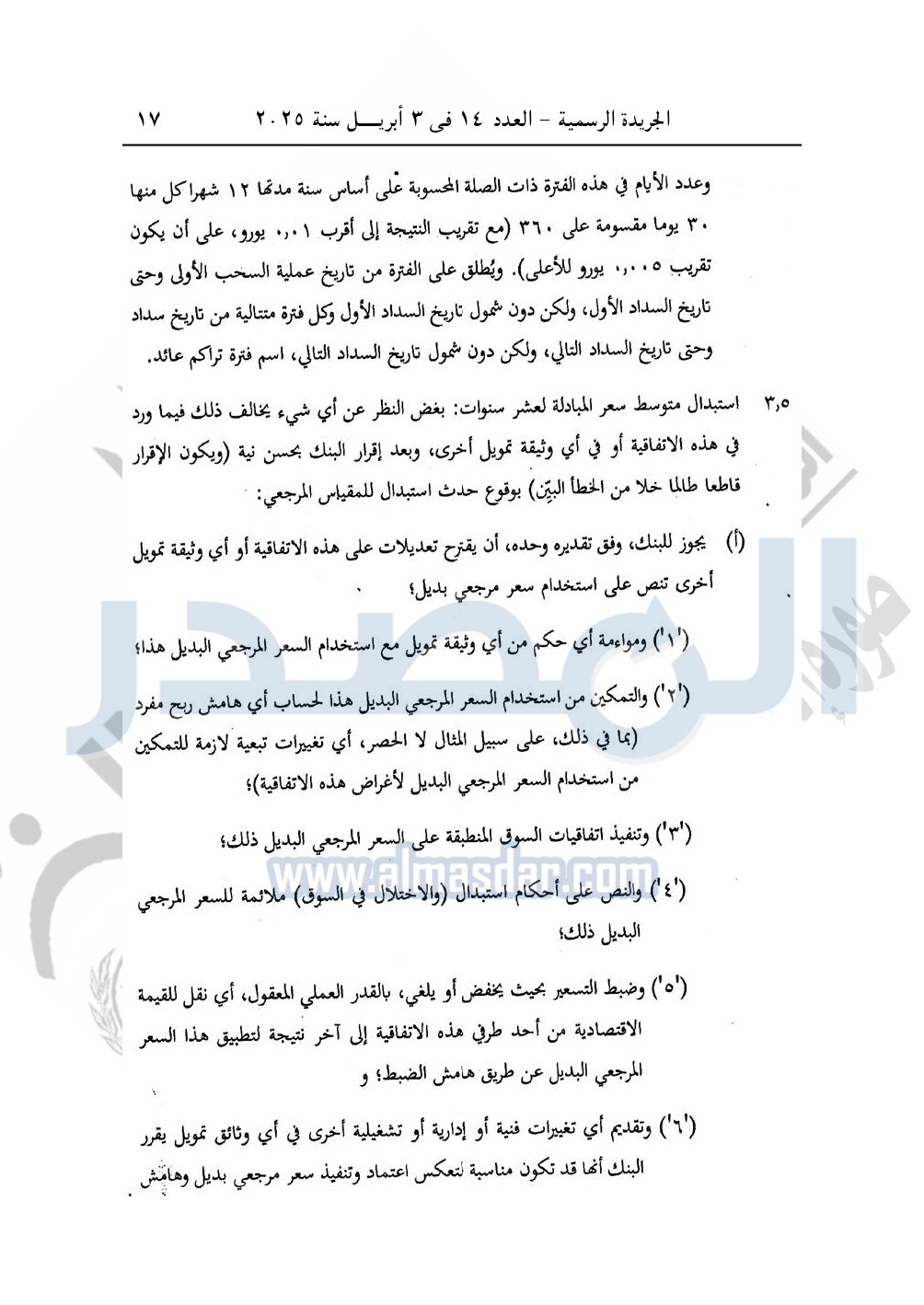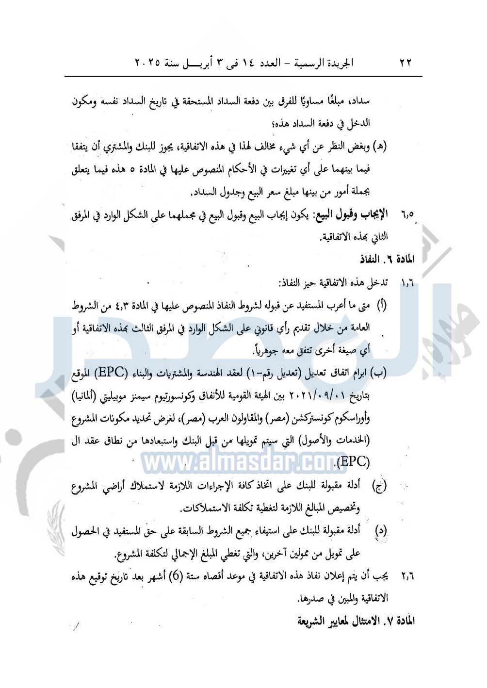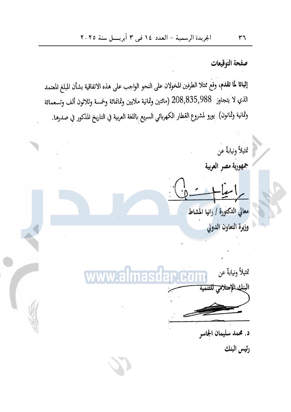 نشرت الجريدة الرسمية في العدد 14، الصادر في 3 أبريل سنة 2025، قرار رئيس جمهورية مصر العربية رقم 219 لسنة 2024، بشأن الموافقة على اتفاق القرض بين حكومة جمهورية مصر العربية والبنك الإسلامي للتنمية بقيمة 318 مليون يورو لإنشاء الخط الأول من شبكة القطار الكهربائي السريع “العين السخنة - العلمين - مرسى مطروح”.