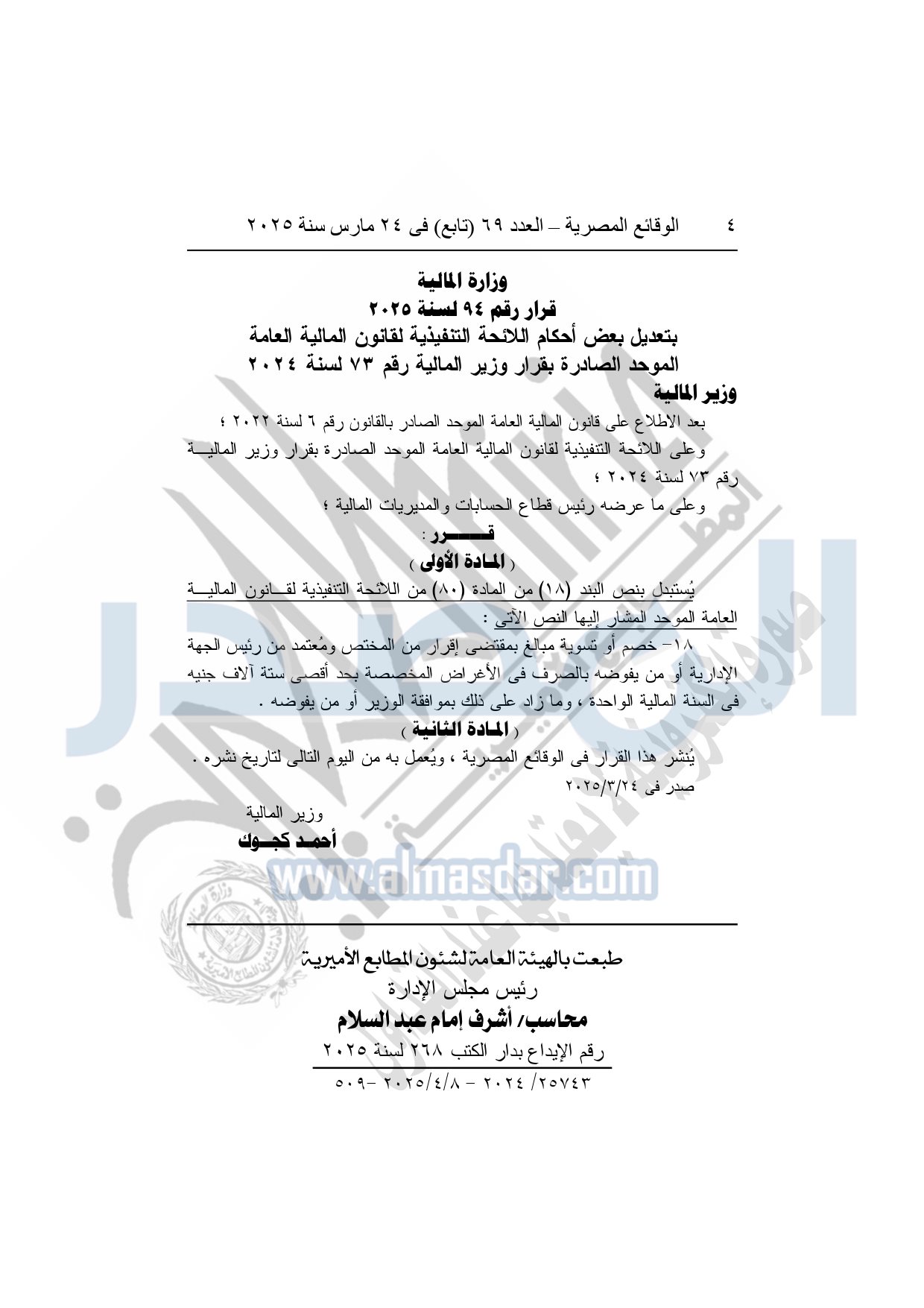 نشرت الوقائع المصرية في العدد 69 تابع، الصادر في 24 مارس سنة 2025، قرار وزارة المالية، رقم 94 لسنة 2025، بشأن تعديل بعض أحكام اللائحة التنفيذية لقانون المالية العامة الموحد الصادرة بقرار وزير المالية رقم 73 لسنة 2024.
