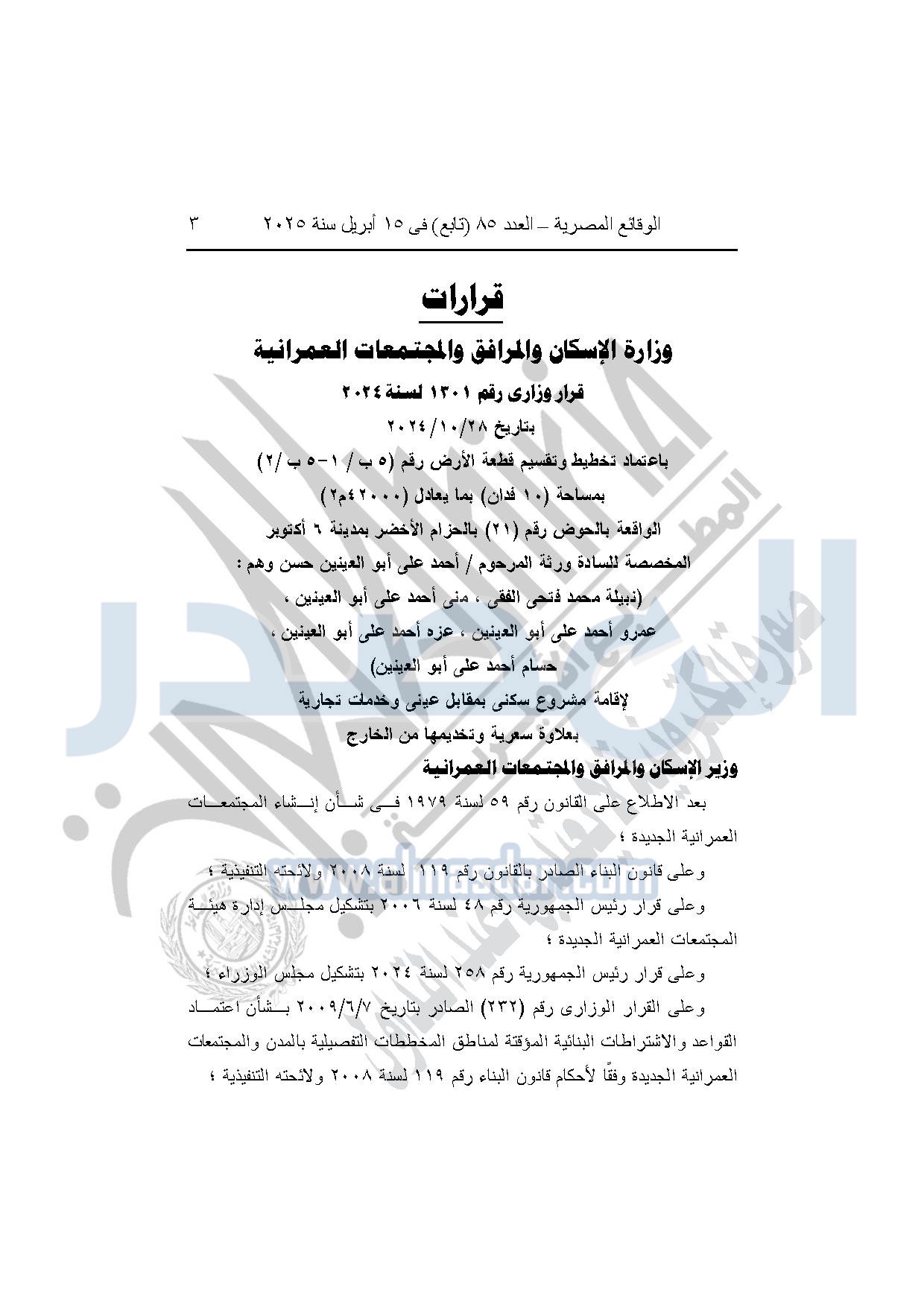 نشرت الوقائع المصرية في العدد 85 "تابع"، بتاريخ 15 أبريل 2025، قرار وزارة الإسكان والمرافق والمجتمعات العمرانية، رقم 1301 لسنة 2024، بتاريخ 28-10-2024، بشأن اعتماد تخطيط وتقسيم قطعة الأرض رقم "5 ب / 1-5 ب / 2" بمساحة "10 فدان" بما يعادل "42000م2" الواقعة بالحوض رقم "21" بالحزام الأخضر بمدينة 6 أكتوبر المخصصة لـ ورثة المرحوم أحمد على أبو العينين حسن وهم: "نبيلة محمد فتحى الفقى، منى أحمد على أبو العينين، عمرو أحمد على أبو العينين، عزه أحمد على أبو العينين، حسام أحمد على أبو العينين" لإقامة مشروع سكنى بمقابل عيني وخدمات تجارية بعلاوة سعرية وتخديمها من الخارج.