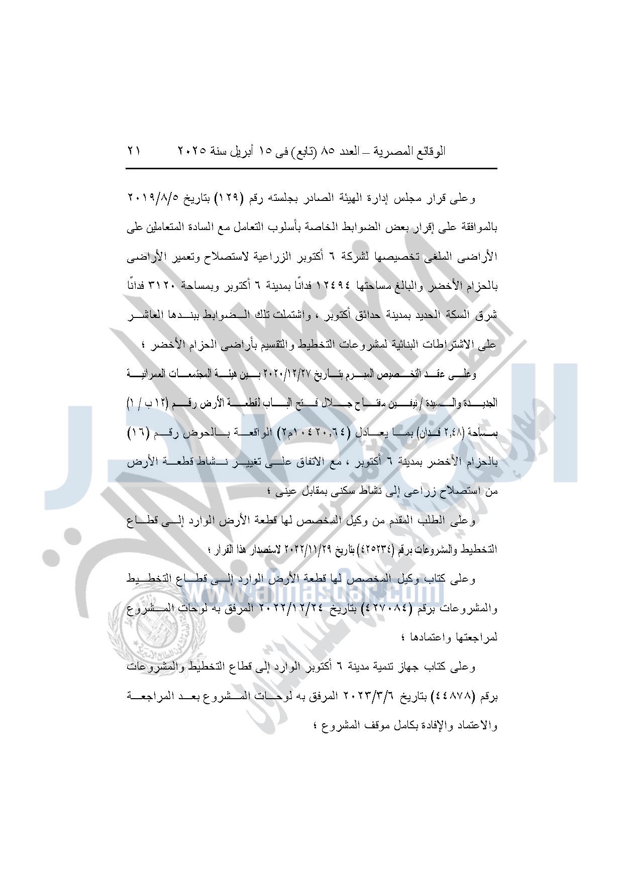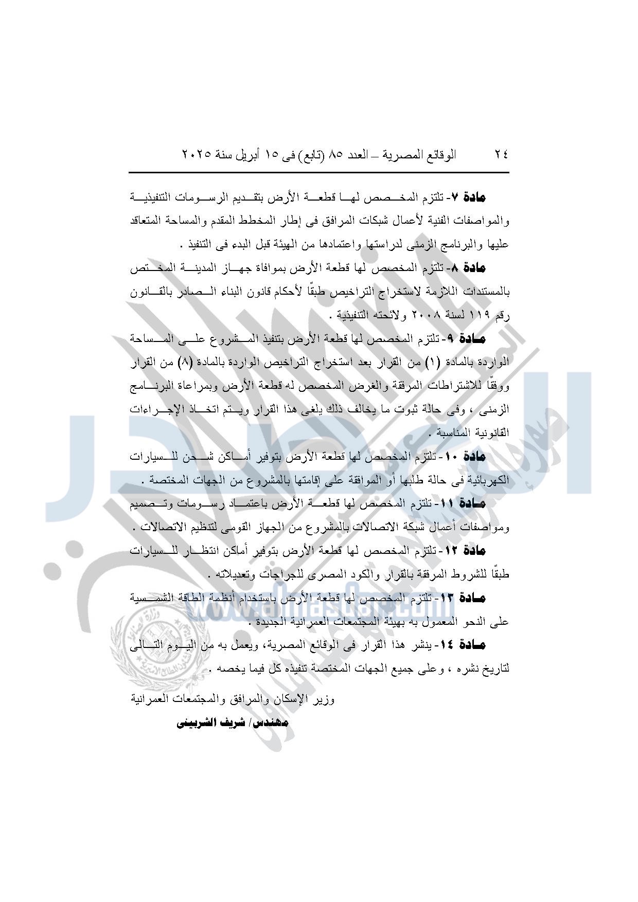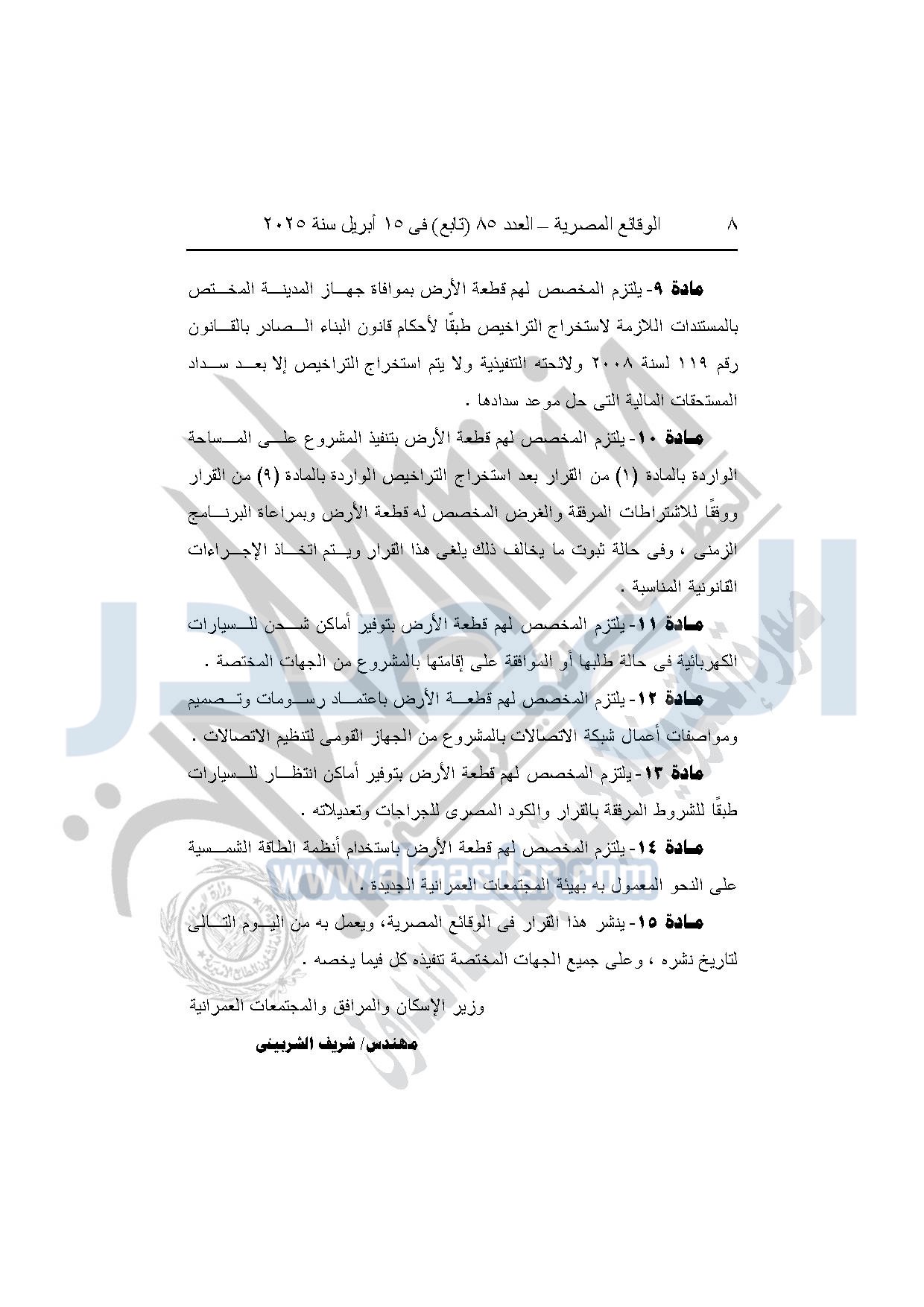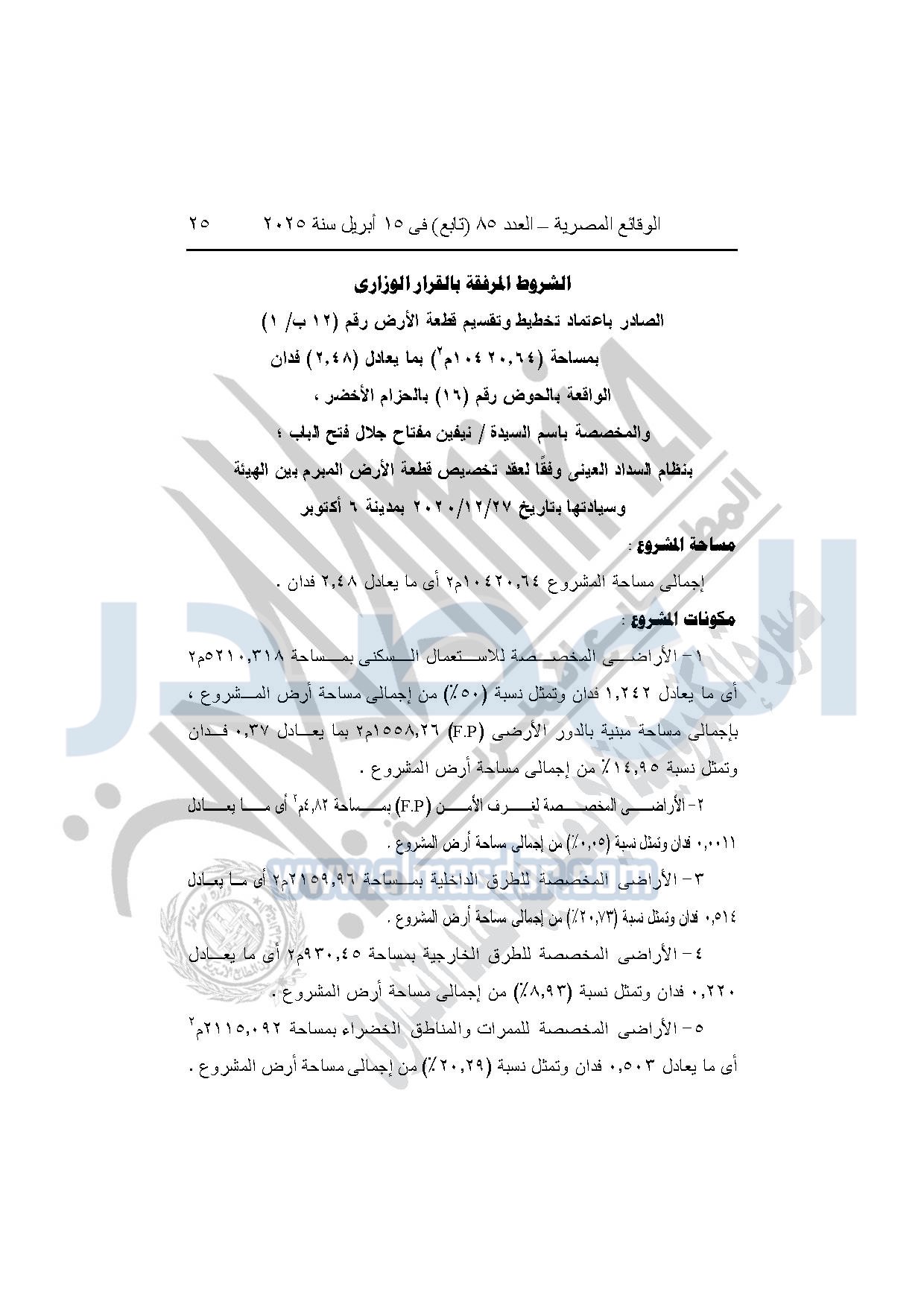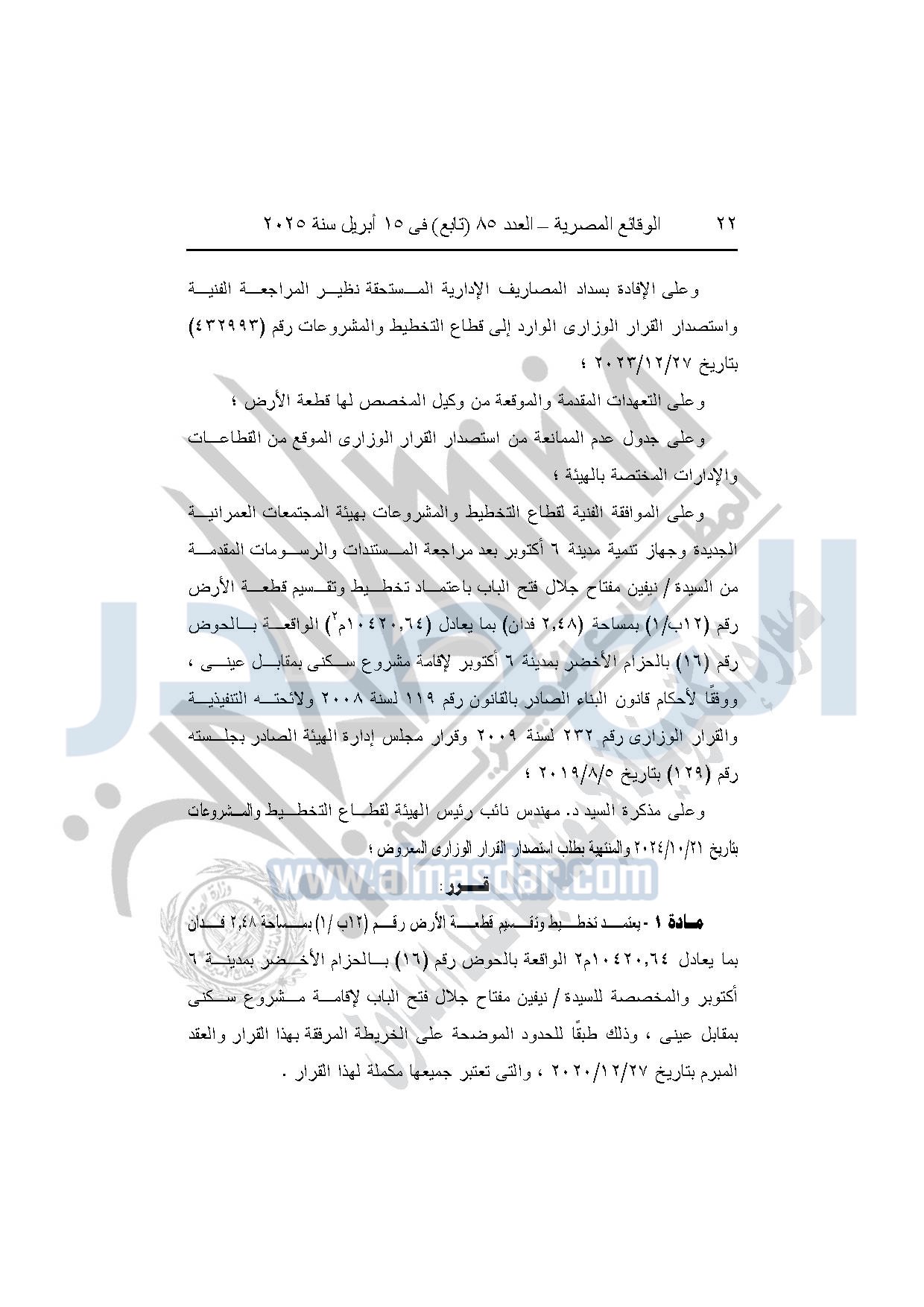 كما نشرت الوقائع المصرية في العدد 85 "تابع"، بتاريخ 15 أبريل 2025، قرار وزارة الإسكان والمرافق والمجتمعات العمرانية، رقم 1302 لسنة 2024، بتاريخ 28-10-2024، بشأن اعتماد تخطيط وتقسيم قطعة الأرض رقم "12 ب / 1" بمساحة "2.48 فدان" بما يعادل "10420.64م2" الواقعة بالحوض رقم "16" بالحزام الأخضر بمدينة 6 أكتوبر المخصصة لـ نيفين مفتاح جلال فتح الباب لإقامة مشروع سكنى بمقابل عيني.