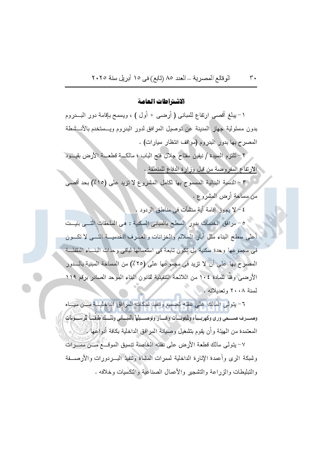 تلتزم المخصص لها قطعة الأرض بالاشتراطات البنائية المعمول بها كحد أقصى وبشرط عدم تجاوز قيود الارتفاع المسموح بها من قبل وزارة الدفاع.