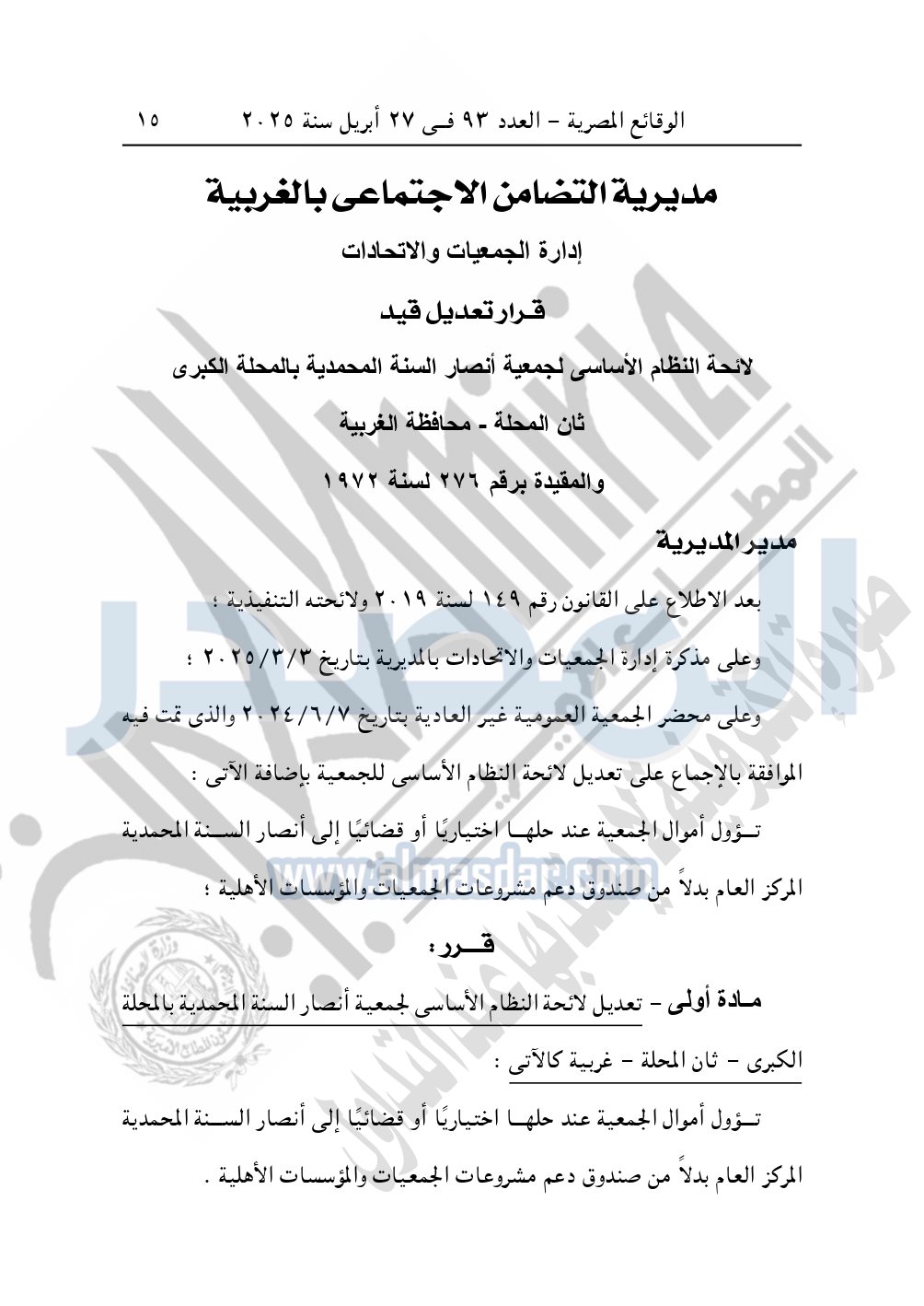 كما نشرت الوقائع المصرية في العدد 93، في 27 أبريل 2025، قرار مديرية التضامن الاجتماعي بالغربية، بشأن قرار تعديل قيد لائحة النظام الأساسي لجمعية أنصار السنة المحمدية بالمحلة الكبرى ثان المحلة - محافظة الغربية، والمقيدة برقم 276 لسنة 1972.