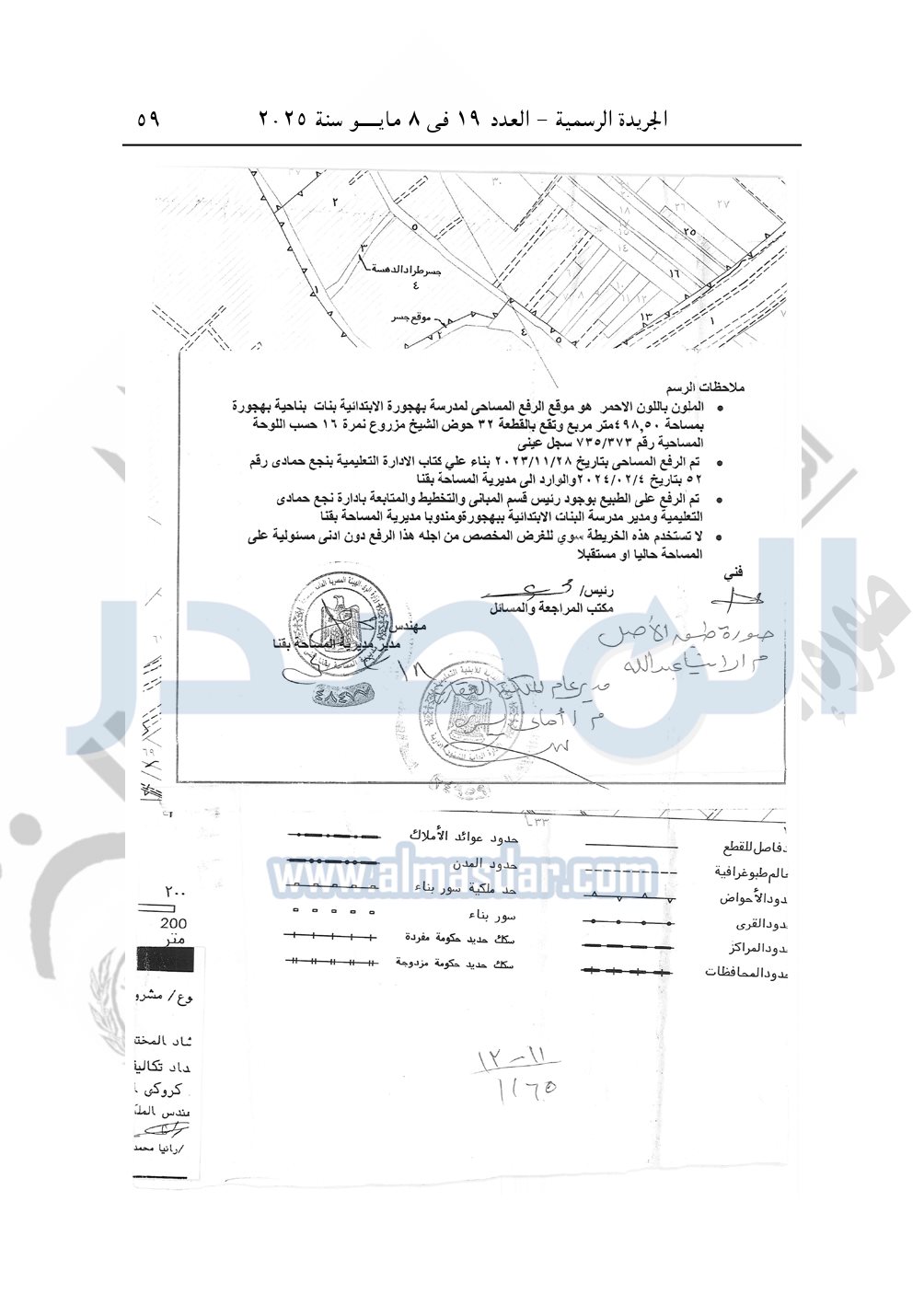 كما نشرت الجريدة الرسمية في العدد 19، الصادر في 8 مايو سنة 2025، قرار رئيس مجلس الوزراء رقم 1165 لسنة 2025، بشأن نزع ملكية عقار مدرسة البنات الابتدائية بقنا.