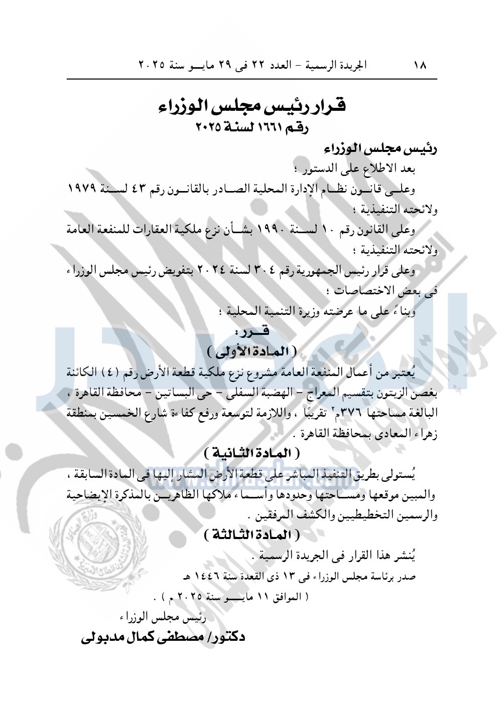 يعتبر من أعمال المنفعة العامة مشروع نزع ملكية قطعة الأرض رقم "4" الكائنة بغصن الزيتون بتقسيم المعراج – الهضبة السفلي - حي البساتين - محافظة القاهرة، البالغة مساحتها 376م2 تقريبًا، واللازمة لتوسعة ورفع كفاءة شارع الخمسين بمنطقة زهراء المعادي بمحافظة القاهرة.