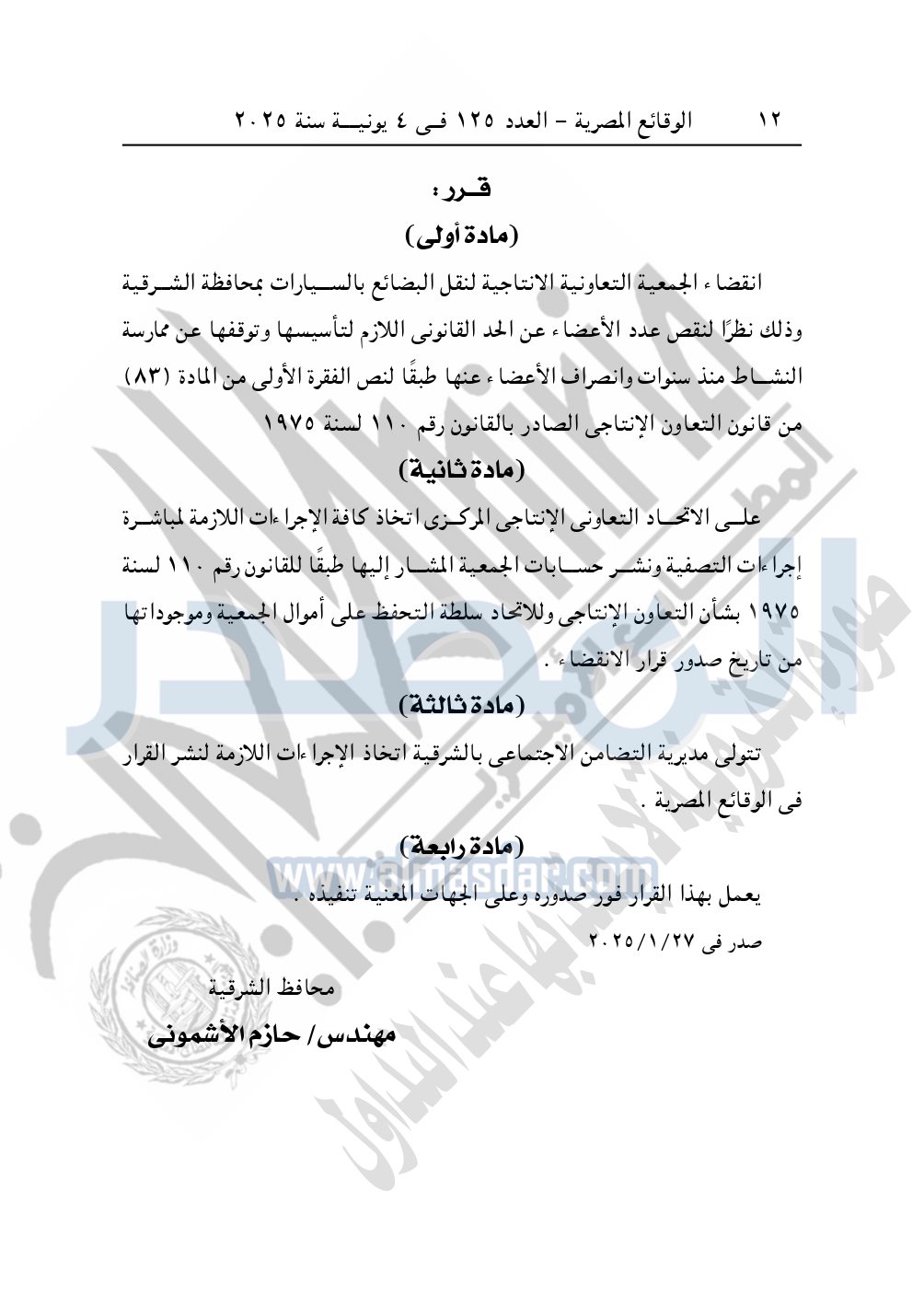 كما نشرت الوقائع المصرية في العدد 125، الصادر في 4 يونية سنة 2025، قرار محافظة الشرقية رقم 206 لسنة 2025، بشأن انقضاء الجمعية التعاونية الانتاجية لنقل البضائع بالسيارات بمحافظة الشرقية.