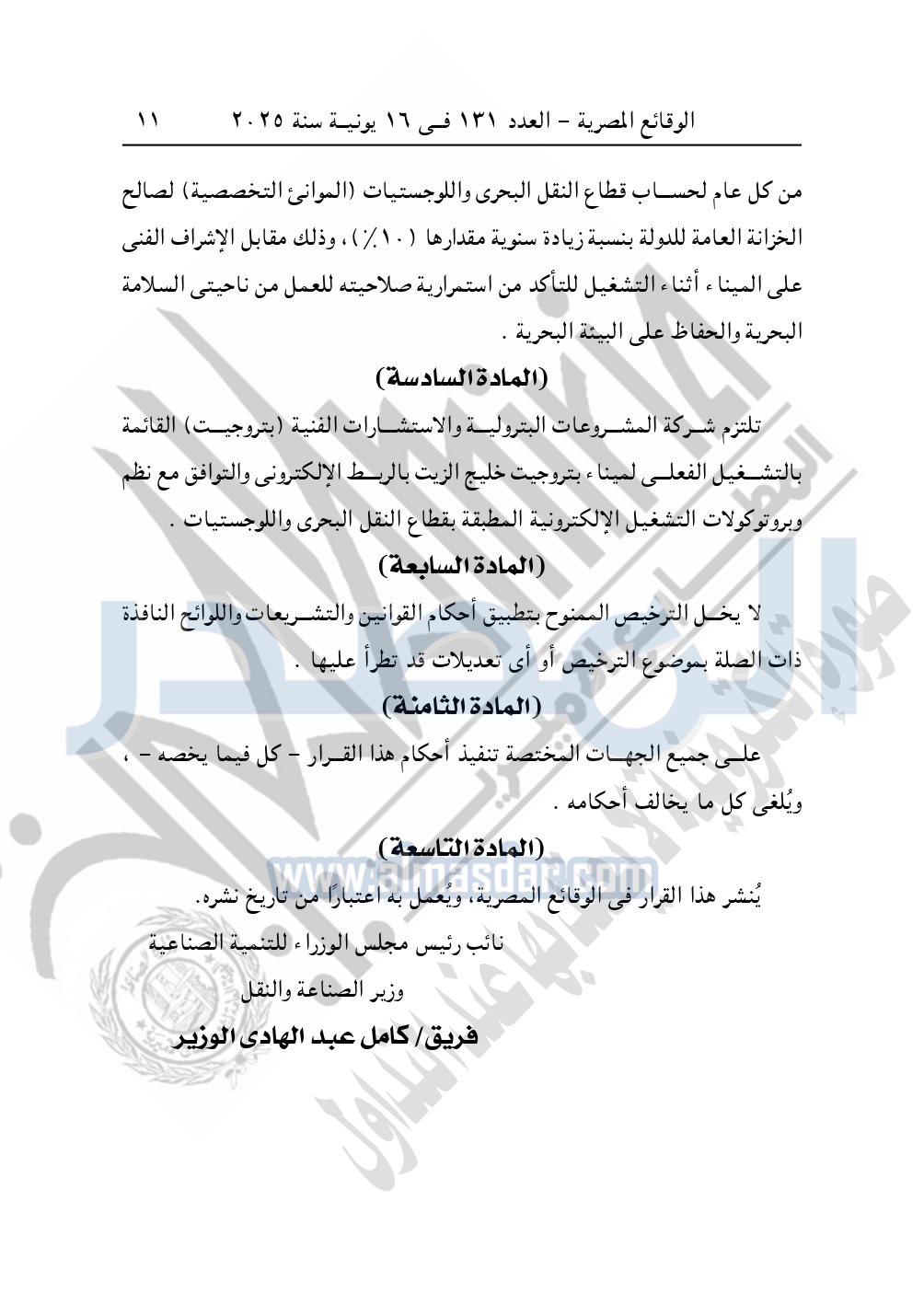 وأضافت الوقائع المصرية، أن القرار جاء بعد الاطلاع أيضا على قرار وزير النقل رقم 301 لسنة 2013 بشأن الترخيص لشركة المشروعات البترولية والاستشارات الفنية "بتروجيت" بتشغيل وإدارة ميناء خليج الزيت وعلى قرار وزير النقل رقم 754 لسنة 2023 باختصاصات قطاع النقل البحرى واللوجستيات؛ وبناءً على ما عرضه رئيس قطاع النقل البحرى واللوجستيات.