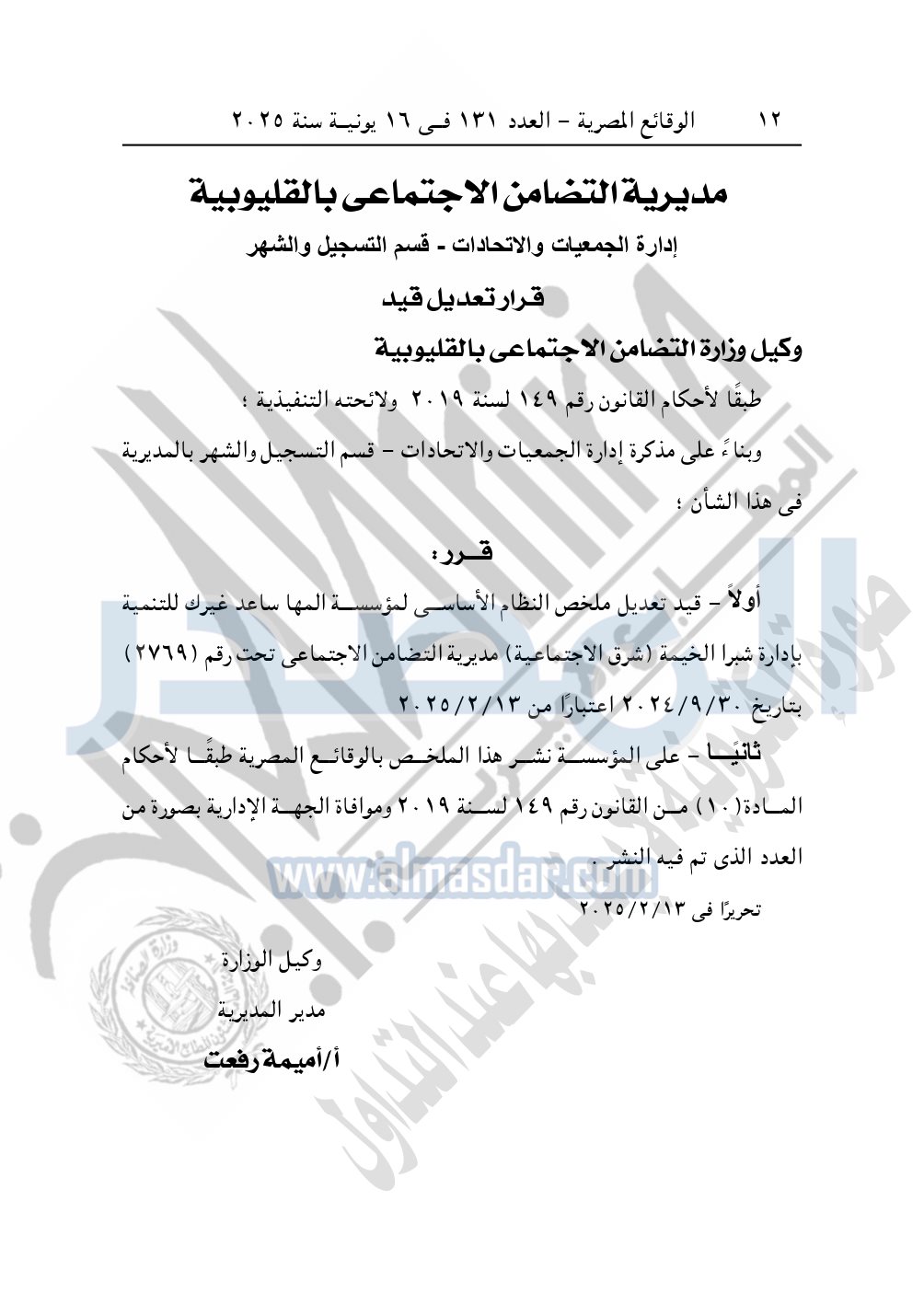 نشرت الوقائع المصرية في العدد 131، بتاريخ 16 يونية 2025، قرار مديرية التضامن الاجتماعي بمحافظة القليوبية، بشأن قرار تعديل قيد مؤسسة المها ساعد غيرك للتنمية والمقيدة برقم 2769.