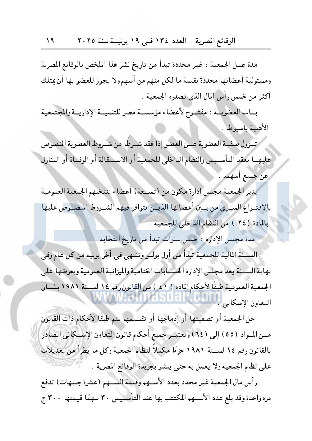 نشرت الوقائع المصرية في العدد 134، بتاريخ 19 يونية 2025، قرار محافظة أسيوط - إدارة التعاون، ملخص عقد التأسيس والنظام الداخلى للجمعية التعاونية، للبناء والإسكان لأعضاء مؤسسة مصر للتنمية الإدارية والمجتمعية الأهلية بأسيوط.
