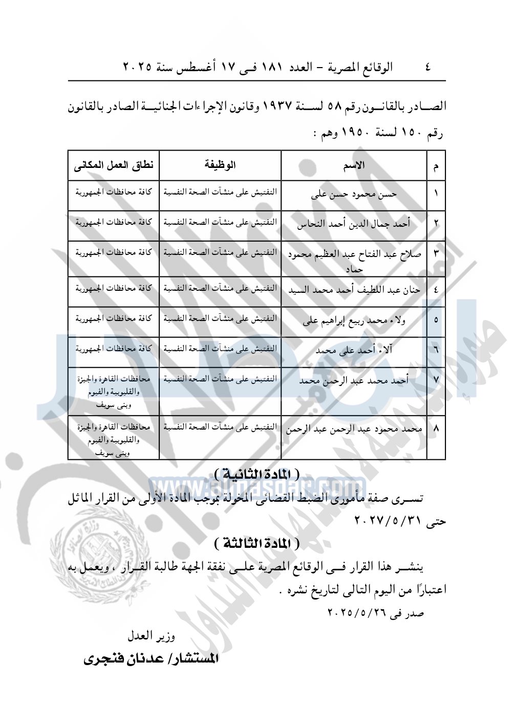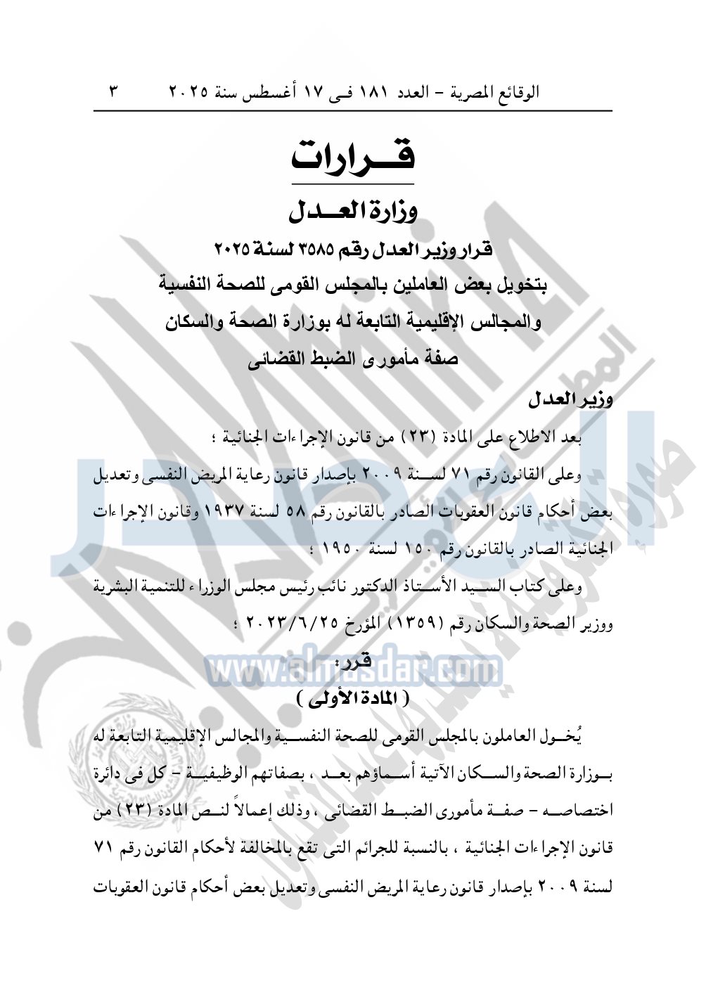 نشرت الوقائع المصرية في العدد 181، الصادر في 17 أغسطس سنة 2025، قرار وزارة العدل، رقم 3585 لسنة 2025، بشأن تخويل بعض العاملين بالمجلس القومى للصحة النفسية صفة مأموري الضبط القضائي.