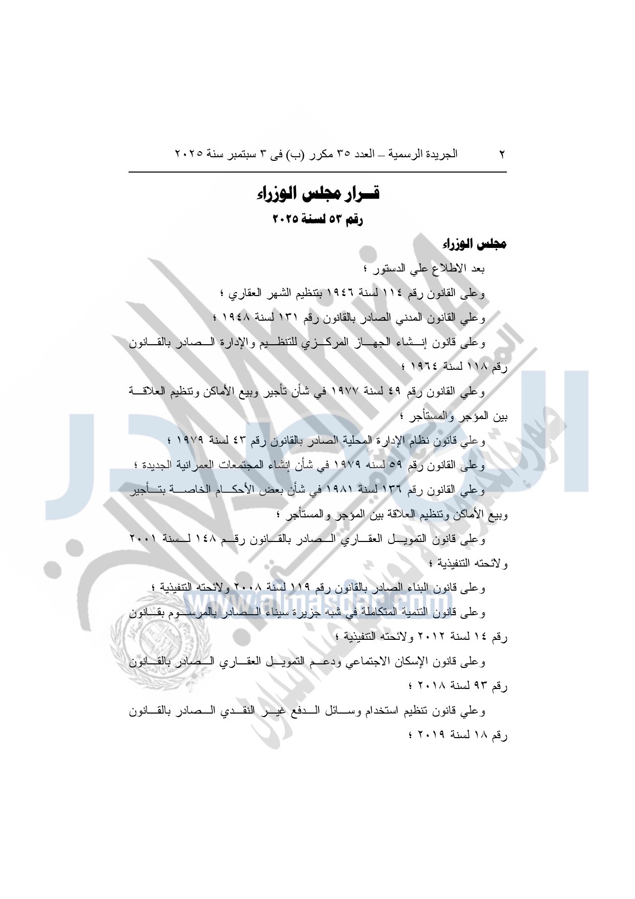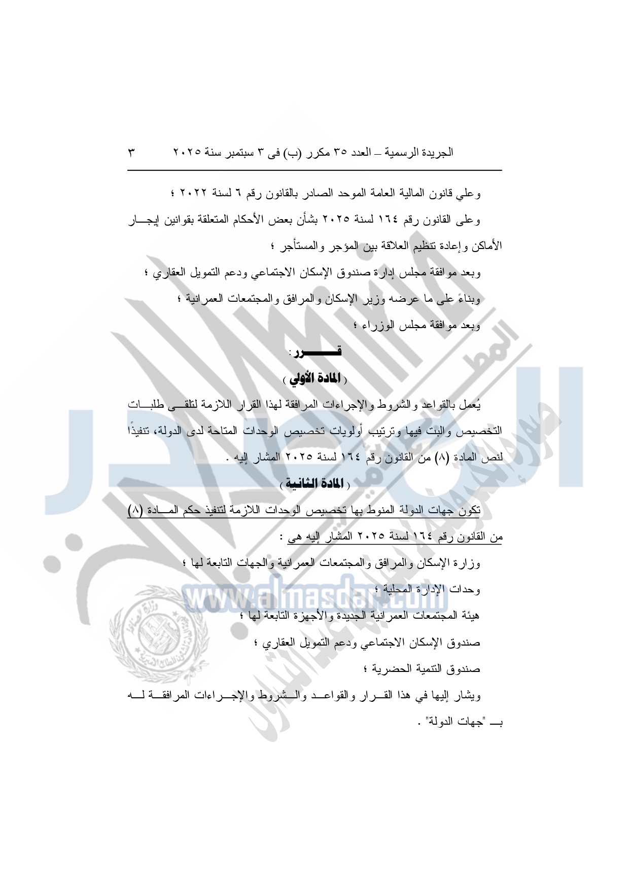 وأشار، مشروع القرار إلى 5 مواد إصدار تضمنت الملامح الرئيسية له، حيث حددت جهات الدولة المنوط بها تخصيص الوحدات اللازمة لتنفيذ حكم المادة "8" من القانون رقم "164" لسنة 2025 المشار إليه، والتي تتمثل في وزارة الإسكان والمرافق والمجتمعات العمرانية والجهات التابعة لها، ووحدات الإدارة المحلية، وهيئة المجتمعات العمرانية الجديدة والأجهزة التابعة لها، وصندوق الإسكان الاجتماعي ودعم التمويل العقاري، وصندوق التنمية الحضرية.