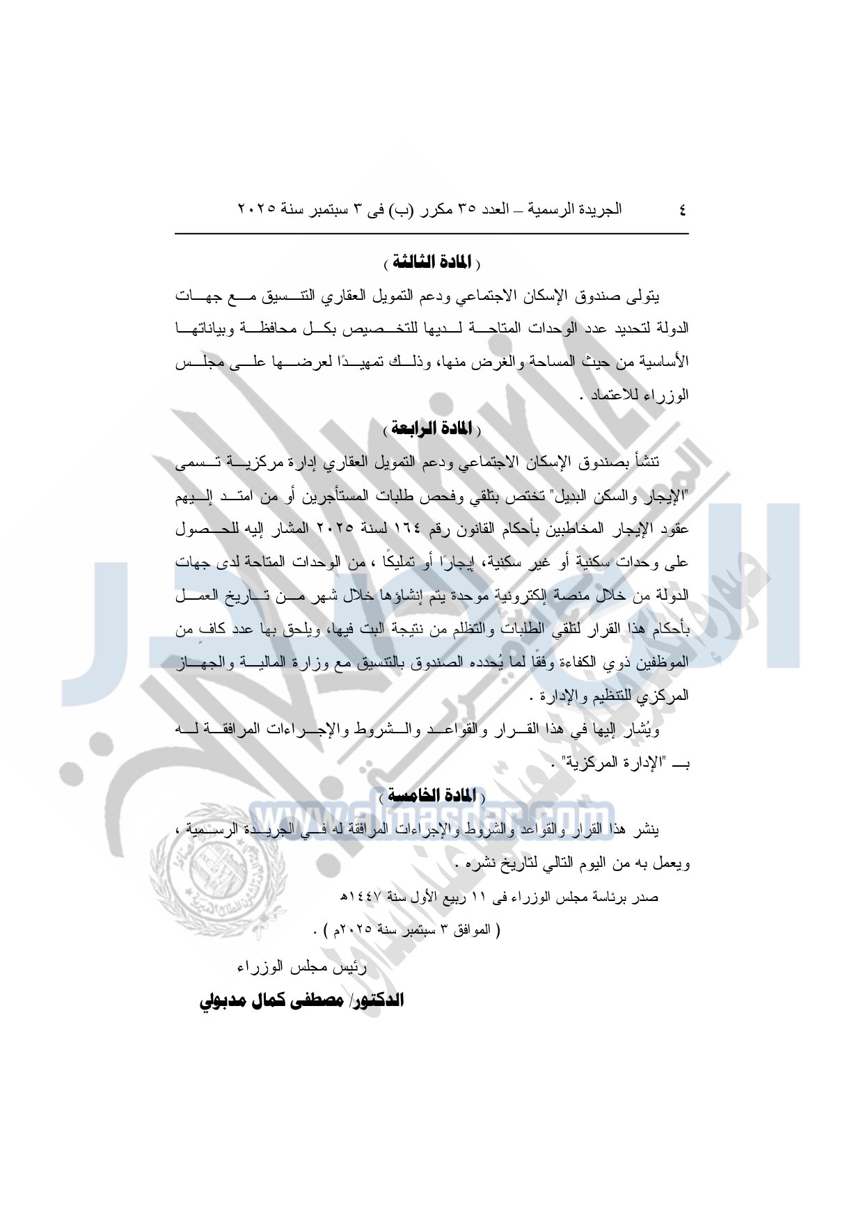 ونص مشروع القرار، على أن يتولى صندوق الإسكان الاجتماعي ودعم التمويل العقاري التنسيق مع جهات الدولة لتحديد عدد الوحدات المتاحة لديها للتخصيص بكل مُحافظة وبياناتها الأساسية من حيث المساحة والغرض منها، وذلك تمهيداً لعرضها على مجلس الوزراء للاعتماد، كما نص على إنشاء إدارة مركزية بالصندوق تسمى "الإيجار والسكن البديل" تتبعها إدارات عامة؛ حيث تختص بتلقي وفحص طلبات المستأجرين أو من امتدت إليهم عقود الإيجار المخاطبين بأحكام القانون رقم 164 لسنة 2025 المشار إليه، للحصول على وحدات سكنية أو غير سكنية.
